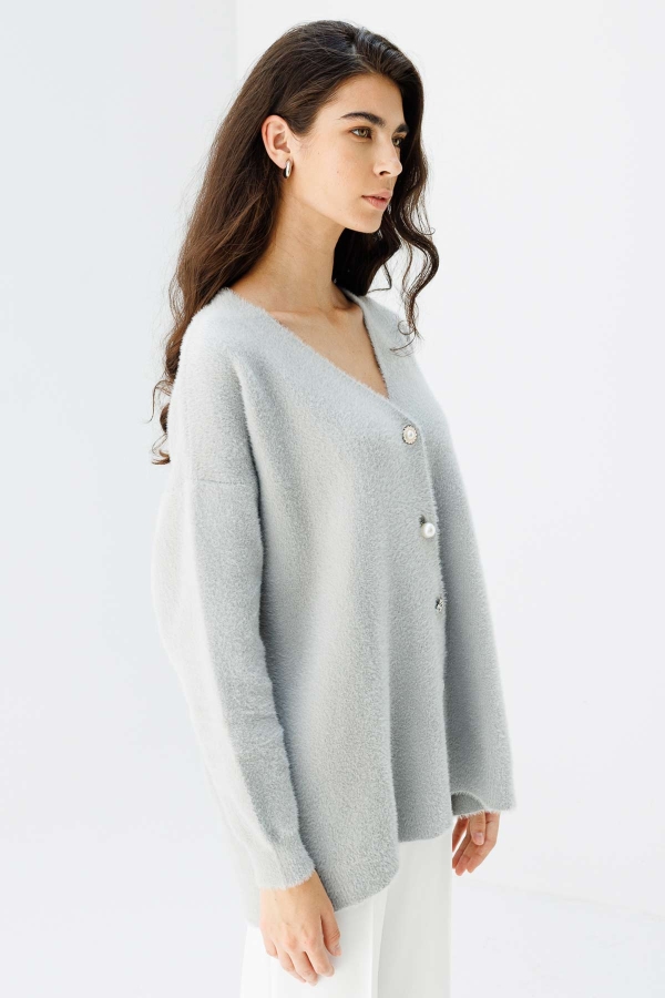 Önden V yaka, taş aksesuar ve inci düğmeler ile tasarlanmış, sakal ipliklerden dokunmuş hırka.