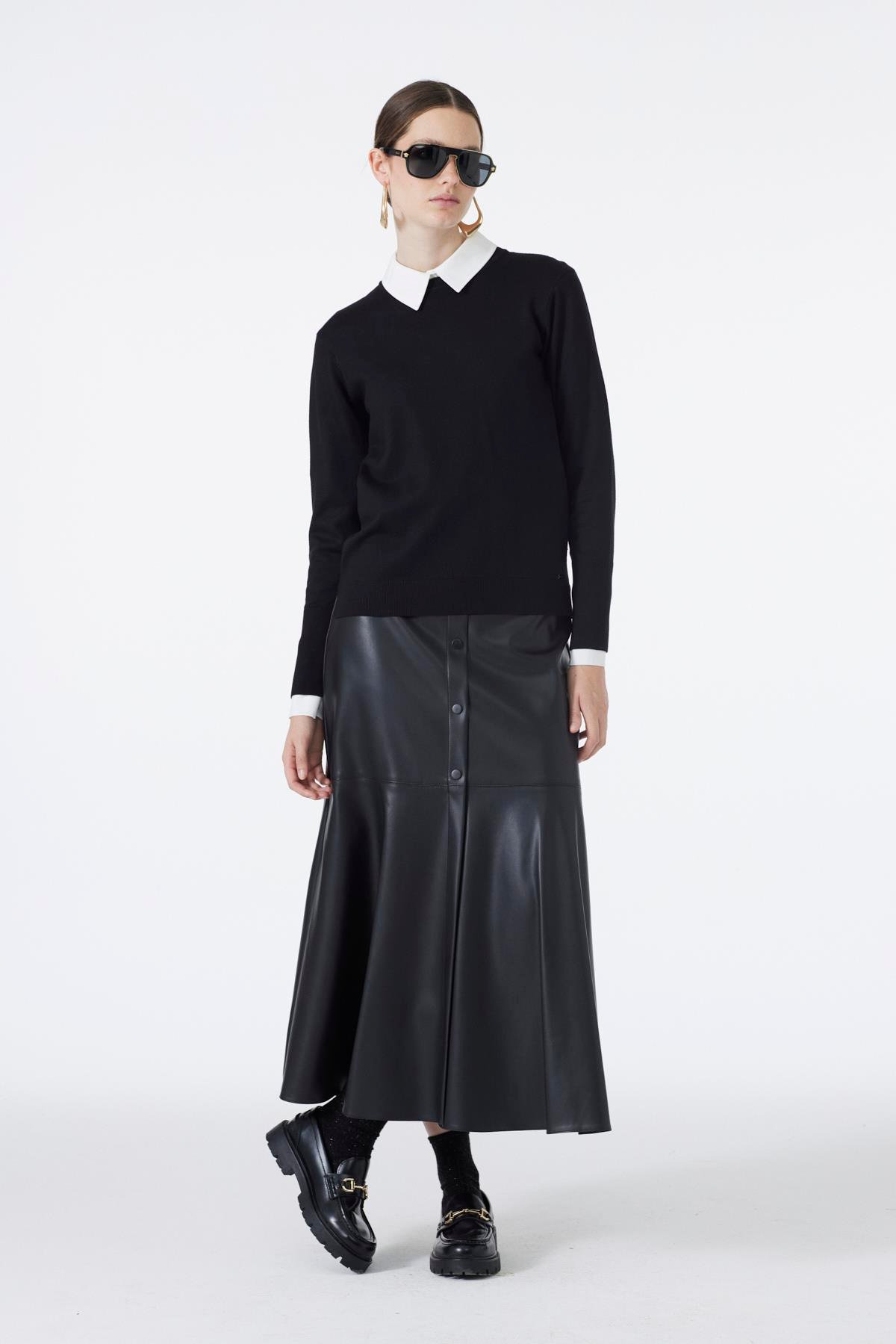 Modern tasarımıyla öne çıkan bu siyah etek, deri görünümlü yapısı ve düğme görünümlü detaylarıyla güçlü ve şık bir duruş sunar. Bel hattını vurgulayan yüksek bel kesimi ve kloş formu sayesinde feminen bir siluet oluşturur. Günlük kombinlerde ve özel davetlerde rahatlıkla tercih edilebilir.