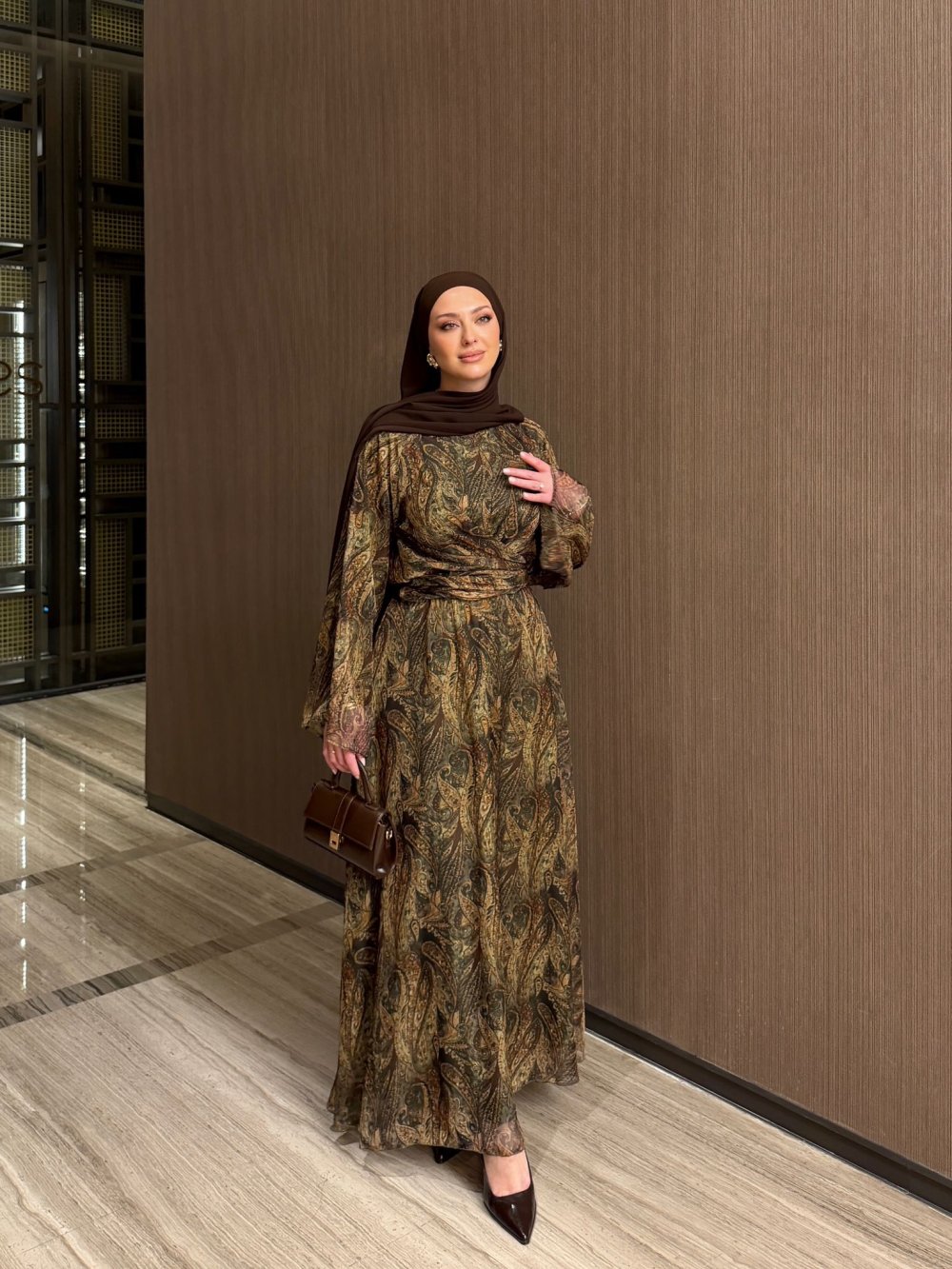 Bu elbise, 1. sınıf desenli ipek şifon kumaştan üretilmiştir. Bel kısmı lastikli olup, astarlı bir yapıya sahiptir. Elbise ölçüleri: Boy: 158cm, Göğüs: 49cm, Bel: 38cm.