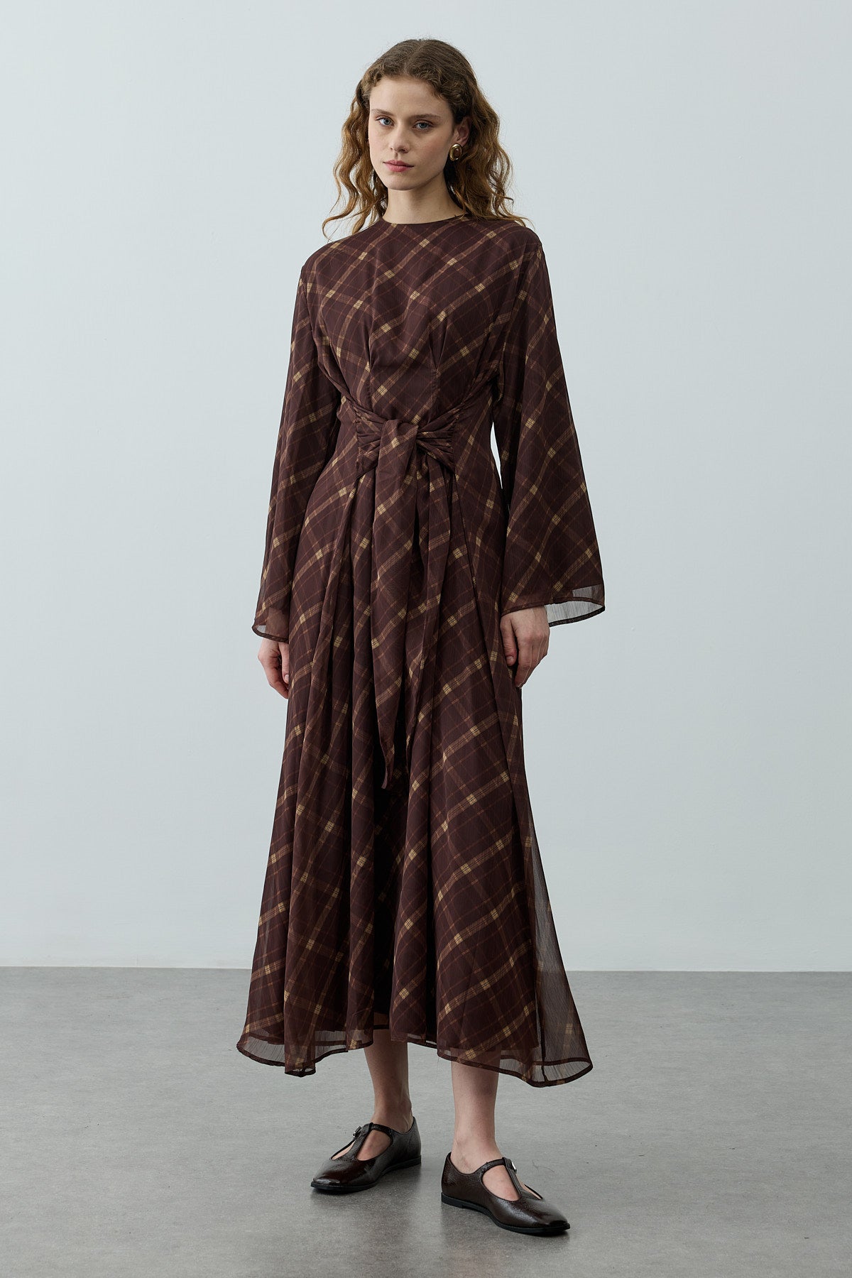 Şifon kumaştan, % 100 pamuk astarlı, uzun geniş kollu, önü bağlama detaylı, sırtı fermuar kapamalı, ekose desenli, maxi boy elbise.