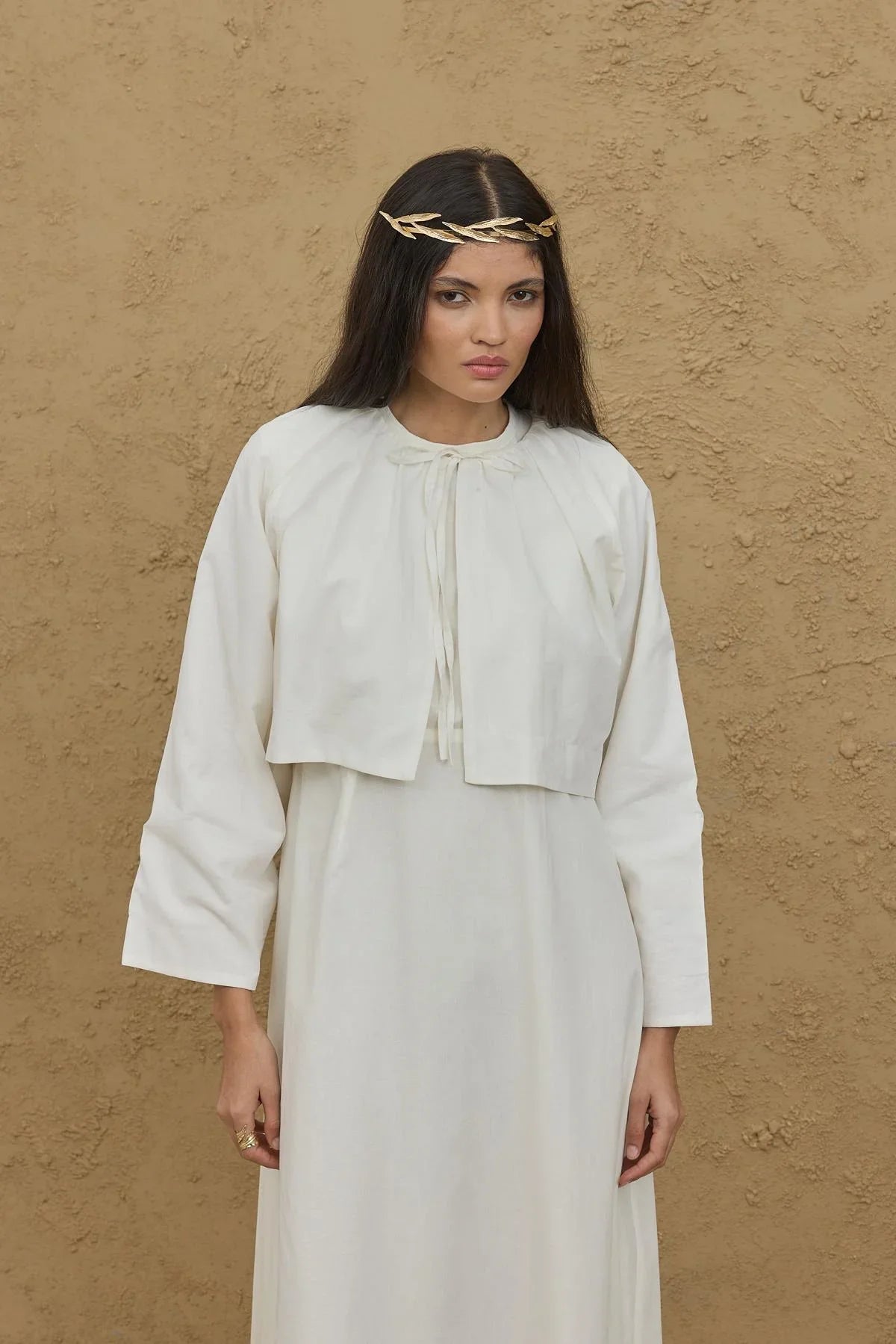 Yüzde yüz pamuk vual kumaştan üretilmiş bu takım, geniş kollu bir kısa ceket ve arkadan fermuarlı kalın askılı bir elbise içerir.