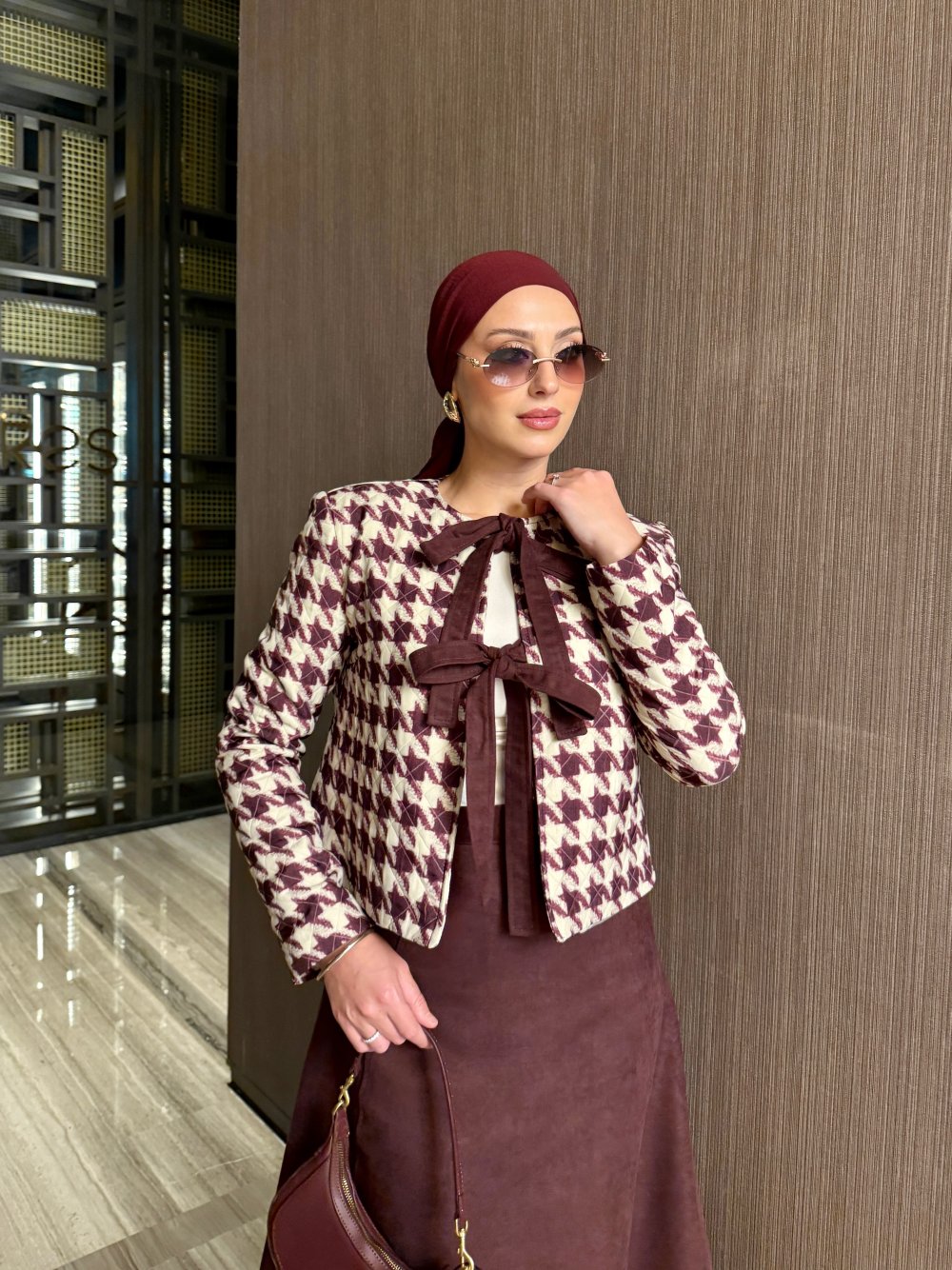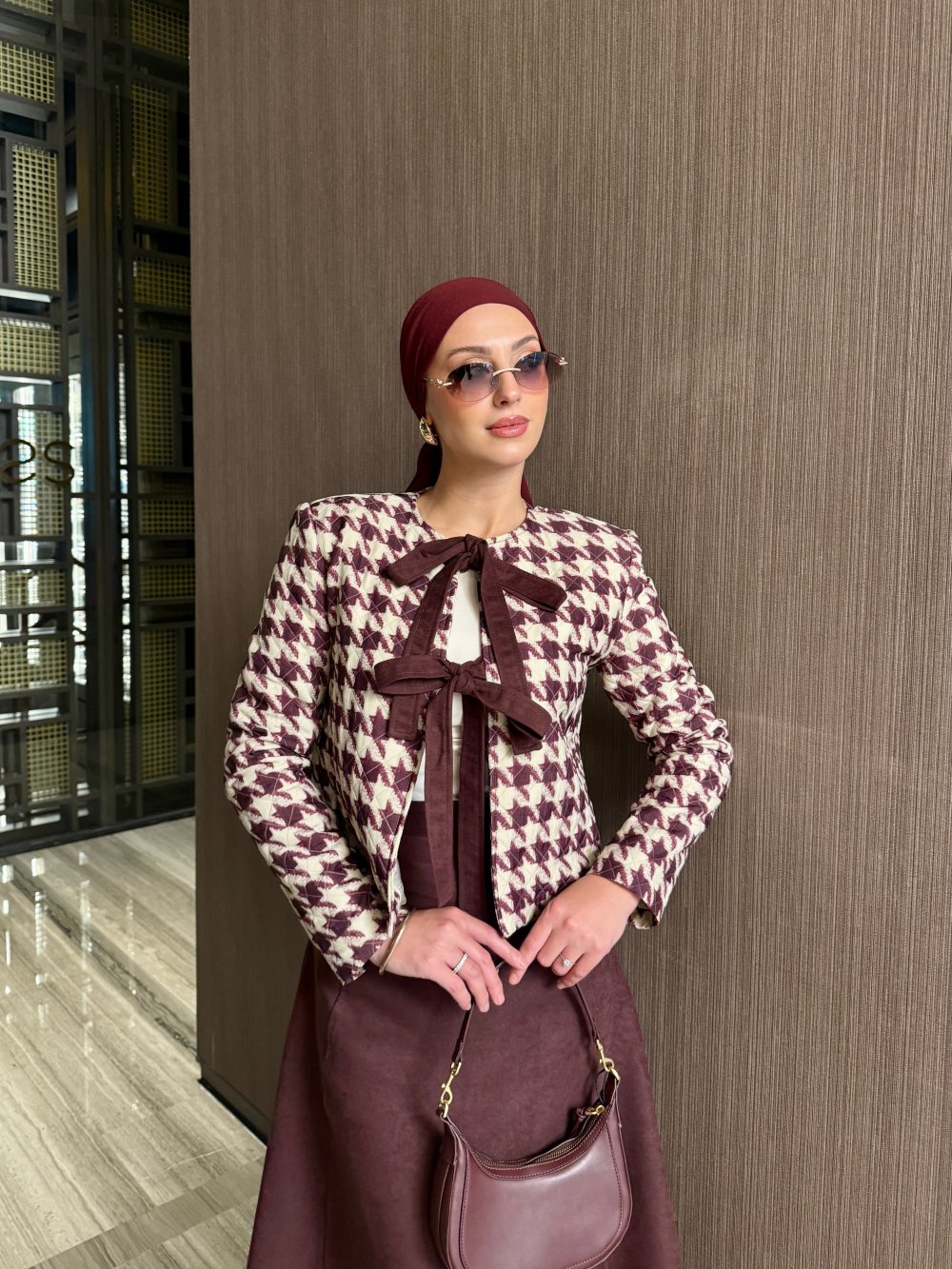 Ceket yorganlı kumaştan yapılmıştır. Etek süet malzemeden üretilmiştir.
