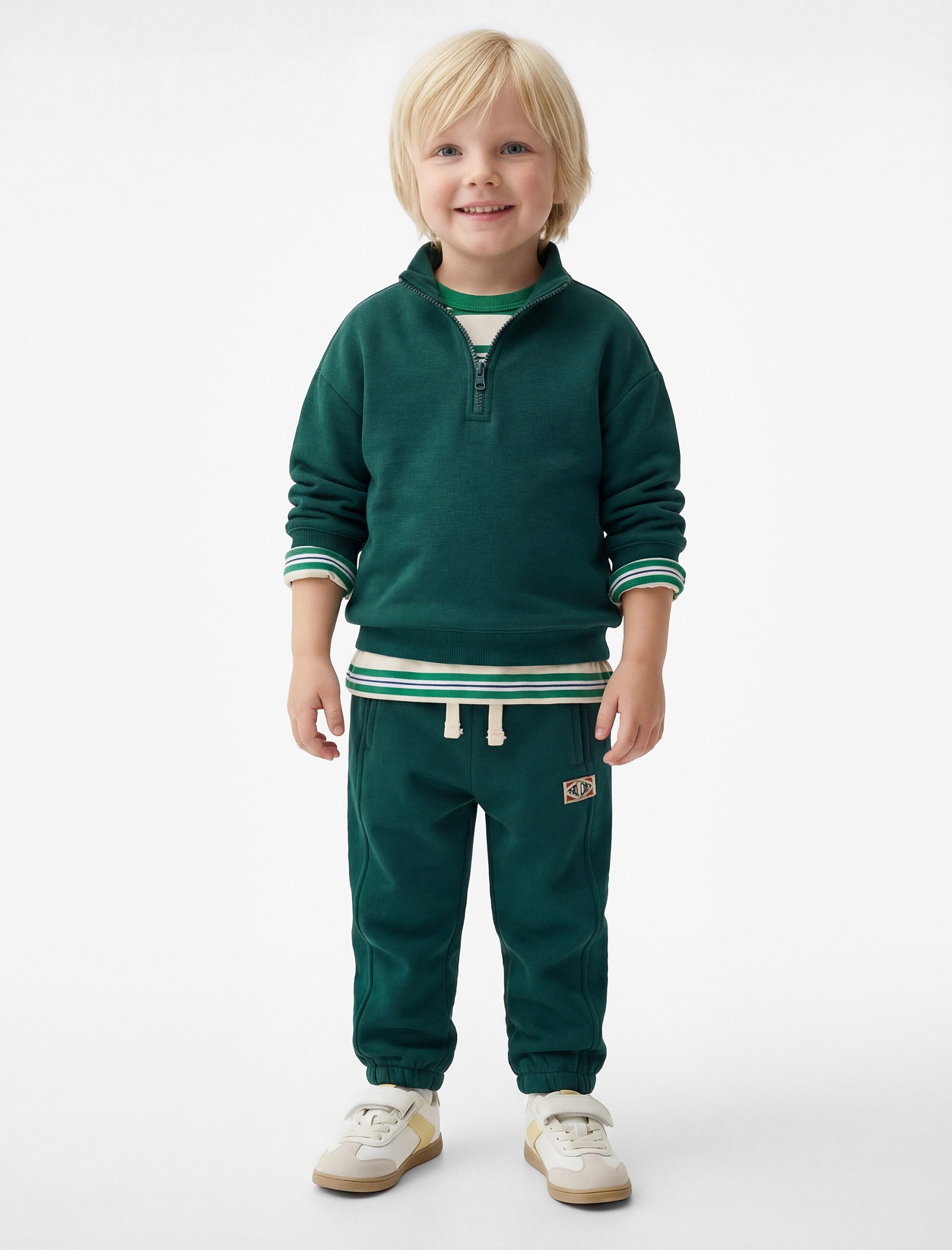 Jogger eşofman altı, yumuşak ve pamuklu kumaşı ve rahat kalıbıyla miniklerin hareket özgürlüğünü destekliyor. Beli ayarlanabilir bağcıklı tasarımı sayesinde kolayca giyilip çıkarılabiliyor. Cep detaylarıyla küçük eşyalarını saklaması için pratiklik sunuyor. Lastikli paçaları ile gün boyu konfor sağlarken, miniklerin enerjisine ayak uyduruyor.