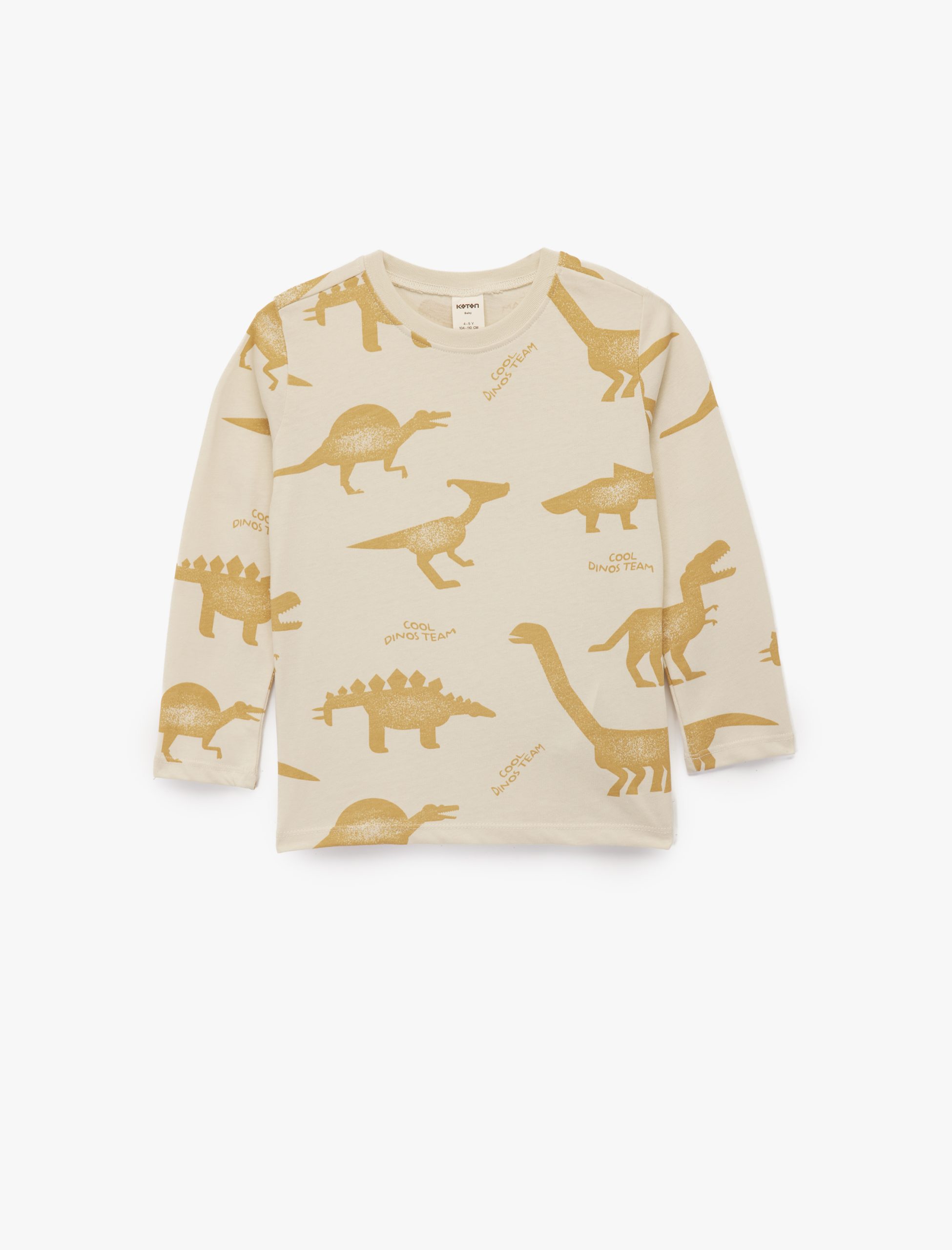 Erkek Bebek Uzun Kollu Bisiklet Yaka Dinozor Baskılı Pamuklu Tişört