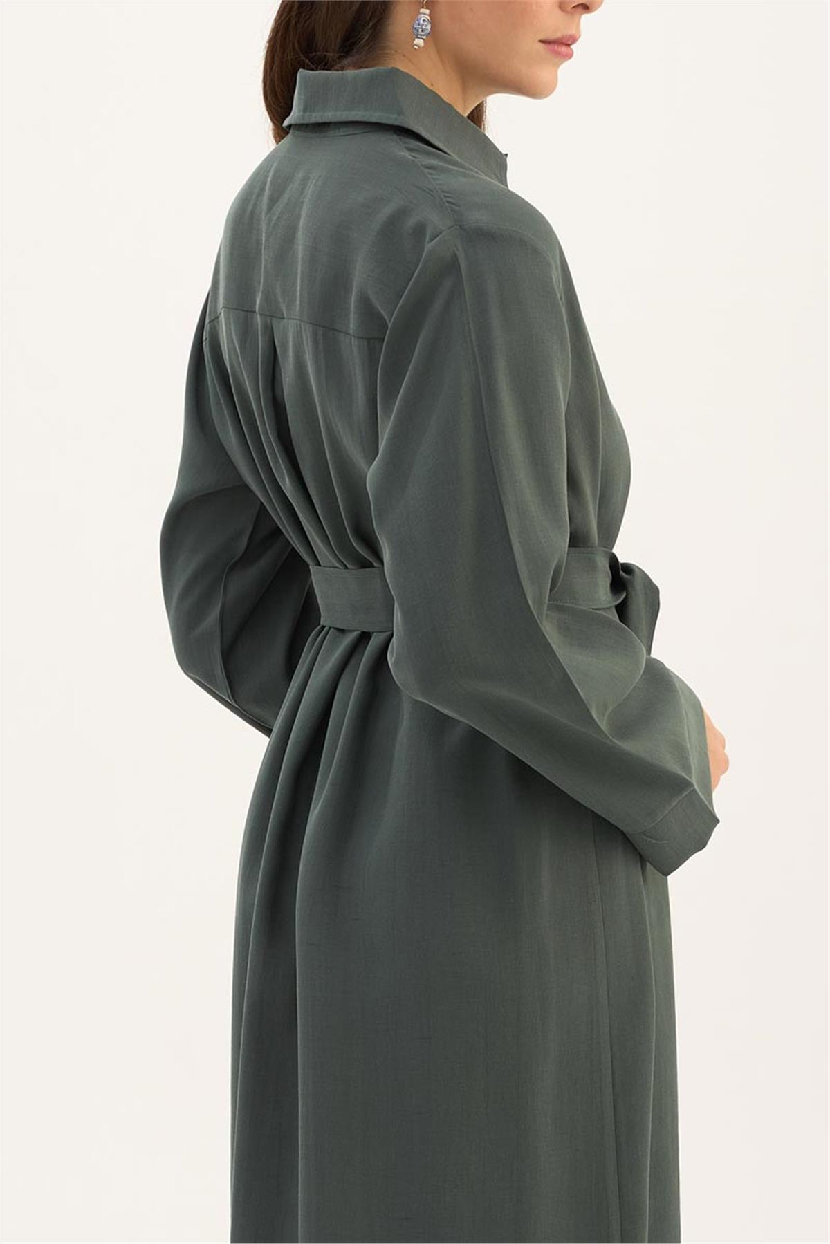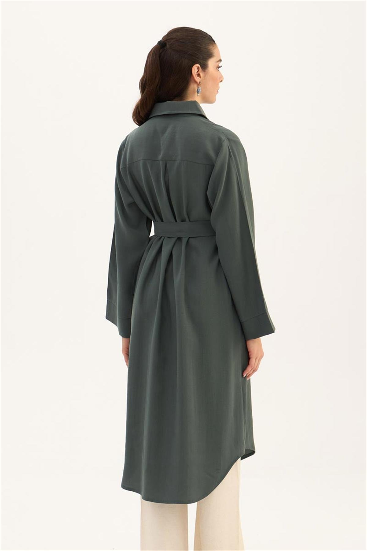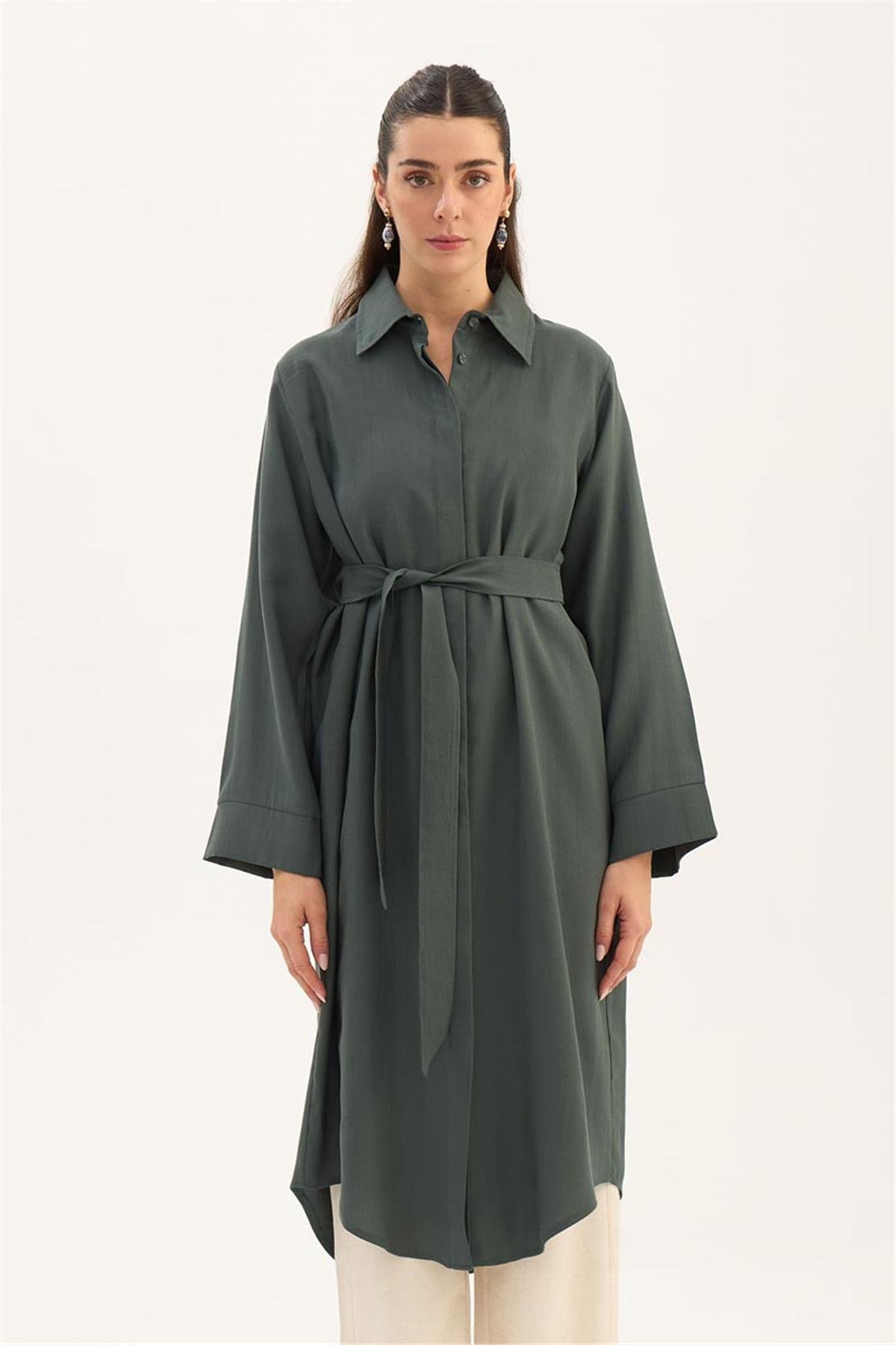 Doğal ve ferah bir görünüm sunan koyu yeşil rengi uzun tunik, yaz sezonunun hafif ve şık parçalarından biri. %88 Tencel ve %12 Pes karışımından üretilen kumaşı, yumuşak dokusu ve nefes alabilir yapısıyla gün boyu konfor sağlar. Minimal tasarımı, gizli patlı düğme detayı ve eteğinde yer alan zarif kavis kesimi ile modern bir duruş sergiler.