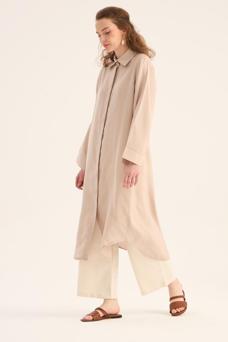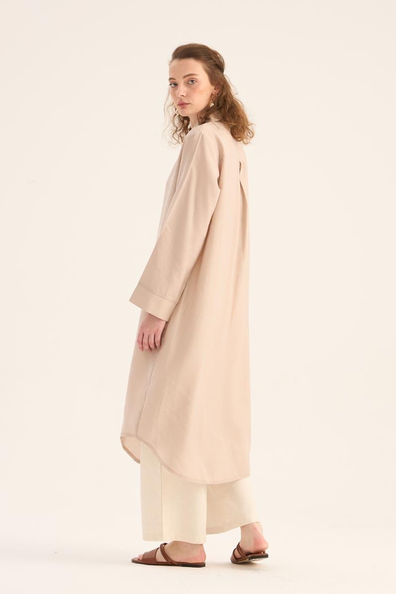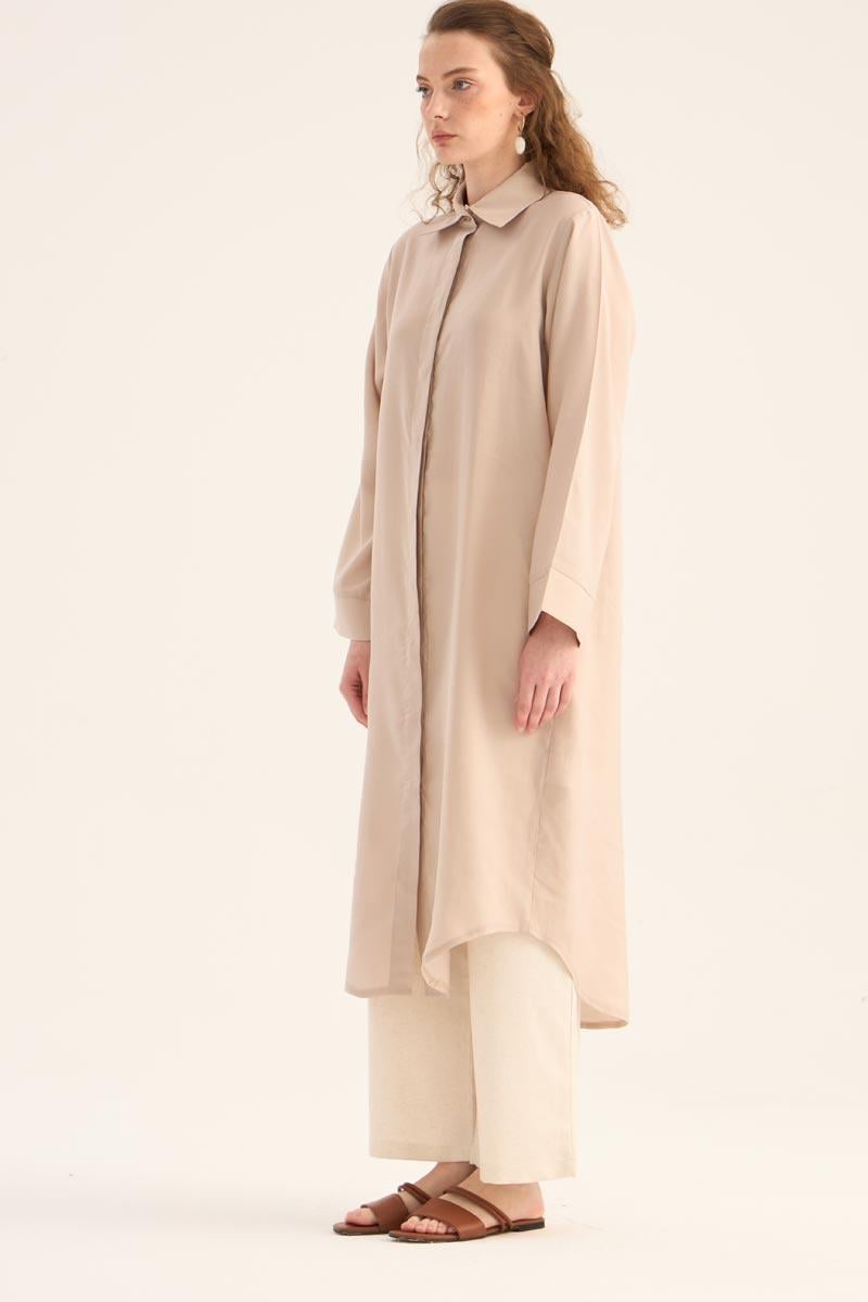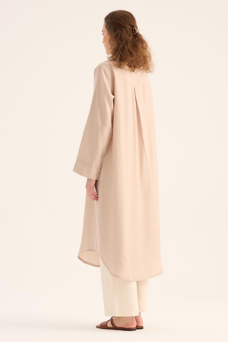 Doğal ve ferah bir görünüm sunan taş rengi uzun tunik, yaz sezonunun hafif ve şık parçalarından biri. %88 Tencel ve %12 Pes karışımından üretilen kumaşı, yumuşak dokusu ve nefes alabilir yapısıyla gün boyu konfor sağlar. Minimal tasarımı, gizli patlı düğme detayı ve eteğinde yer alan zarif kavis kesimi ile modern bir duruş sergiler.