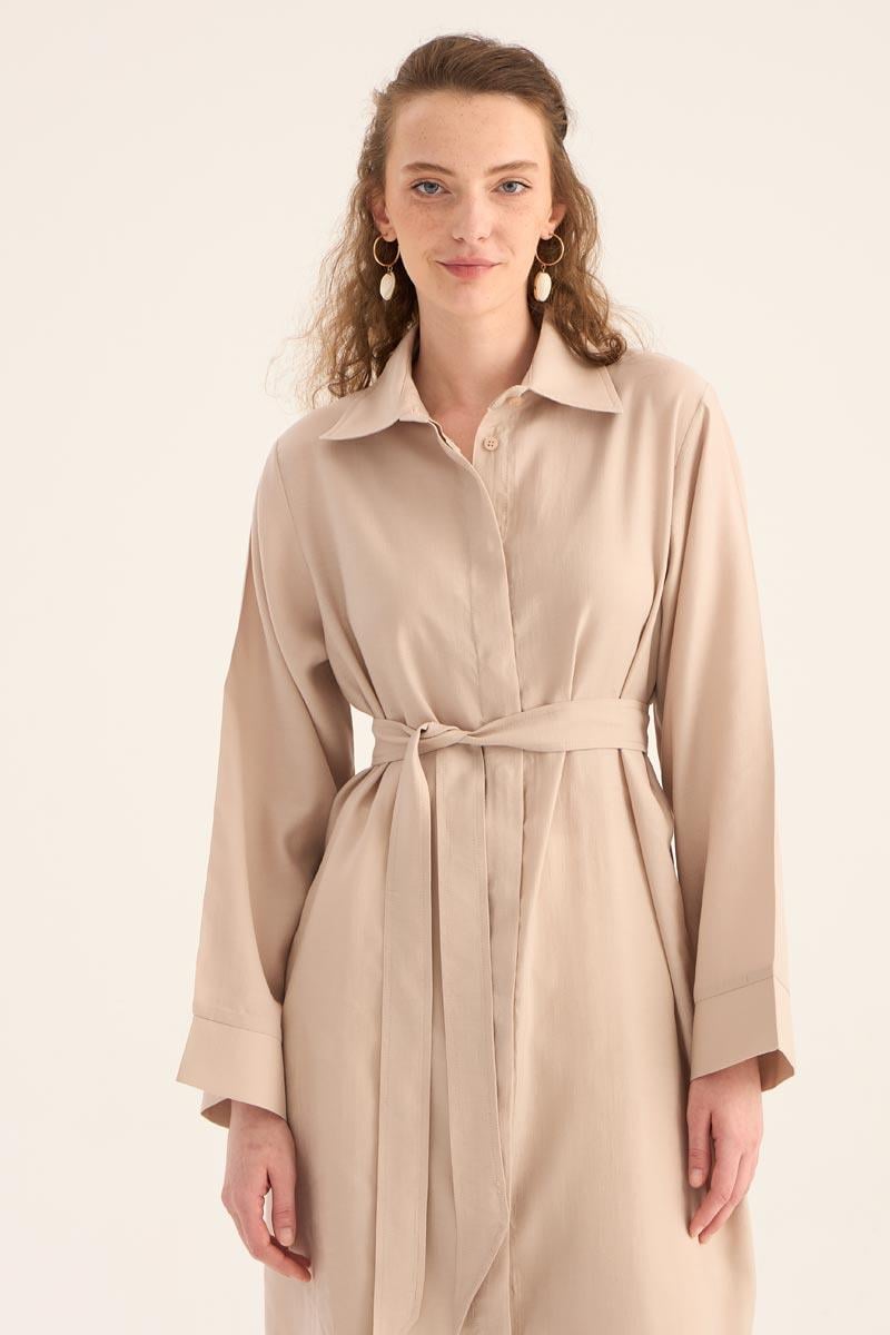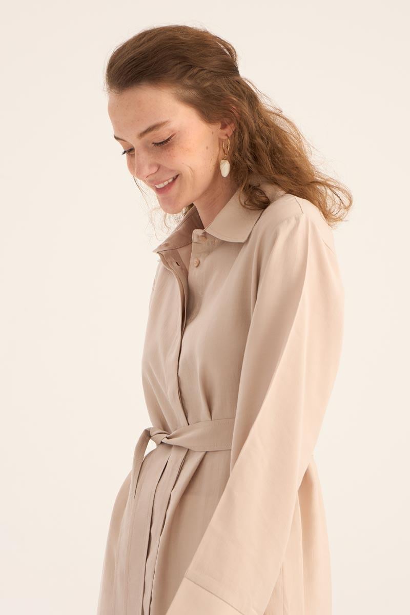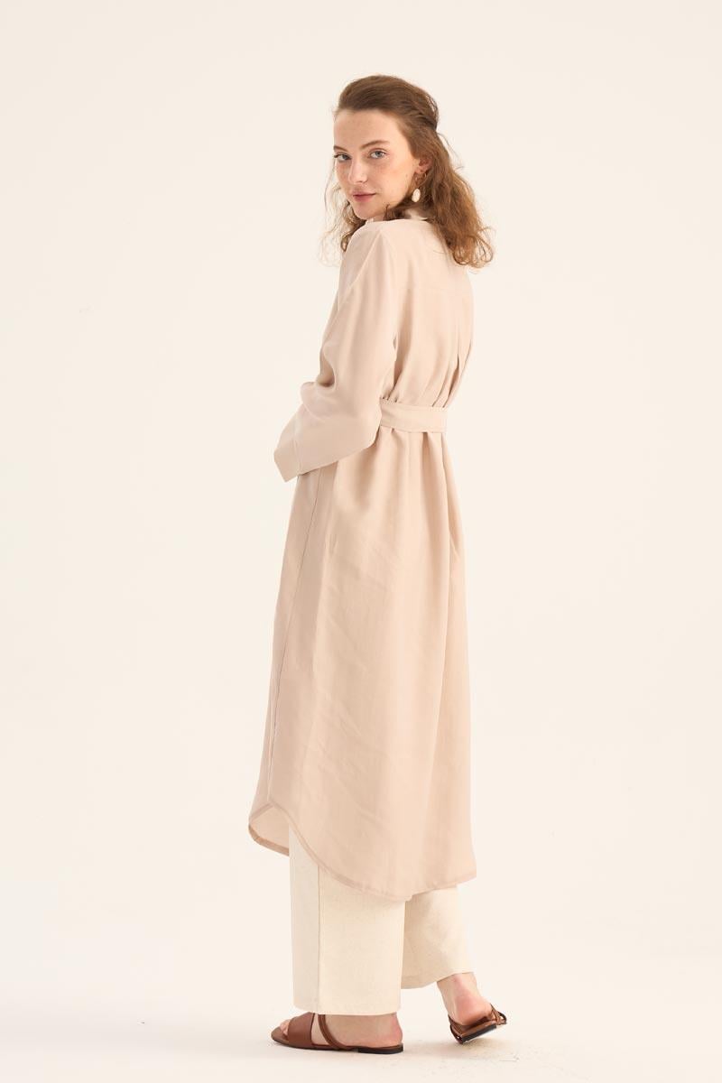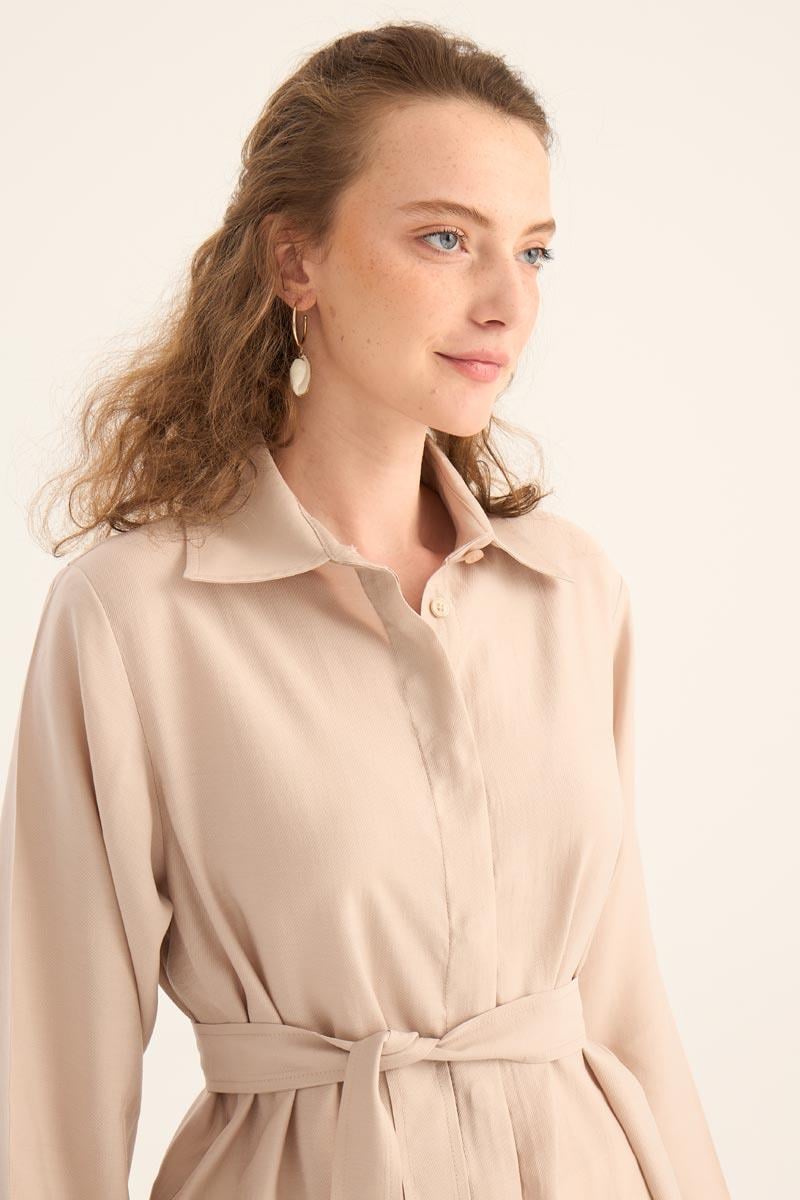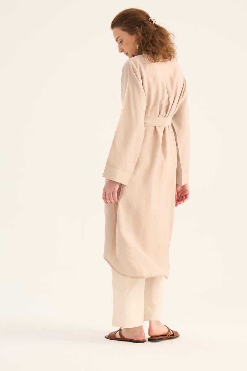Doğal ve ferah bir görünüm sunan taş rengi uzun tunik, yaz sezonunun hafif ve şık parçalarından biri. %88 Tencel ve %12 Pes karışımından üretilen kumaşı, yumuşak dokusu ve nefes alabilir yapısıyla gün boyu konfor sağlar. Minimal tasarımı, gizli patlı düğme detayı ve eteğinde yer alan zarif kavis kesimi ile modern bir duruş sergiler.