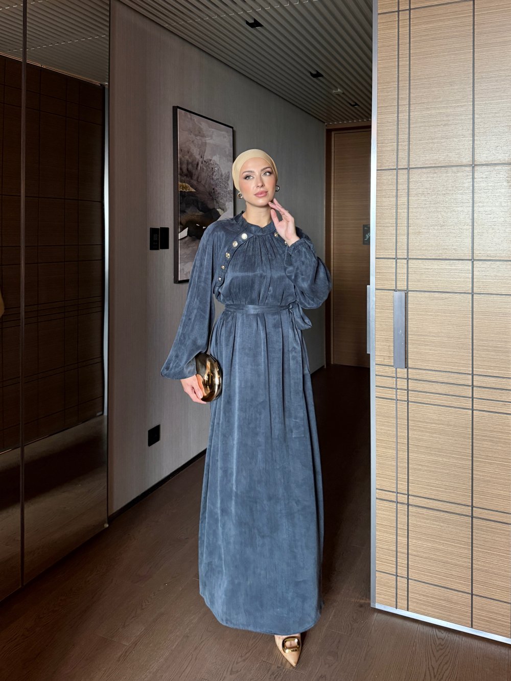 Işıltılı saten dokusuyla asil bir duruş sergileyen bu abiye, zarif kesimi ve inci detaylı kemeriyle şıklığı en sade haliyle yansıtıyor. Davetlerde ve özel günlerde sofistike bir görünüm arayanlar için ideal bir seçim.