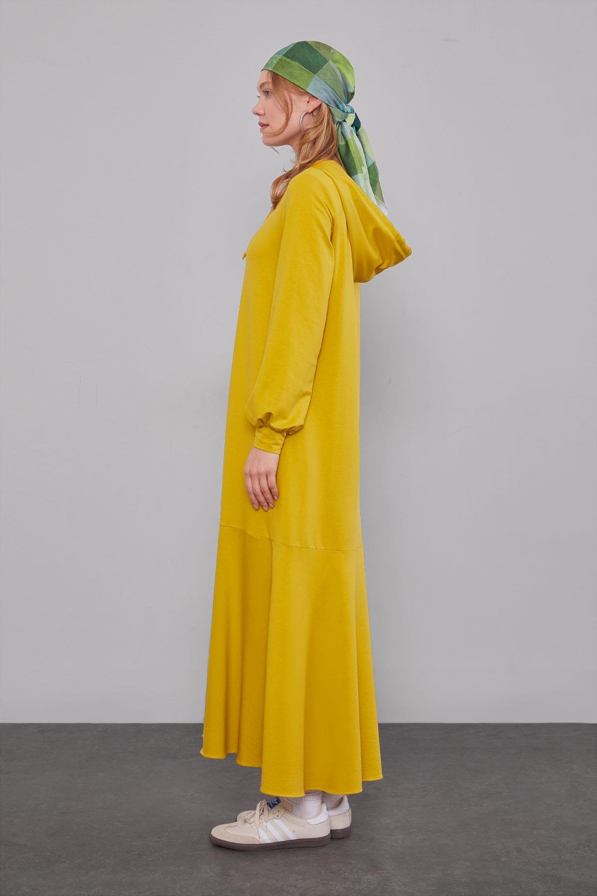 Kapüşonlu gizli cep detaylı elbisemizi royal şallarımızla tarzınıza hava katarak kullanabilirsiniz. Dört mevsim rahatlıkla tercih edebileceğiniz ürünümüz diz üstünde başlayan volan detaylarıyla şıklığınızı ön plana çıkarıyor.