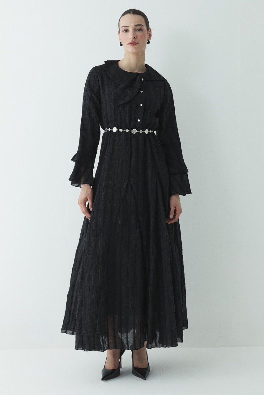 Fiyonk Detay Çizgili Astarlı Elbise – Siyah