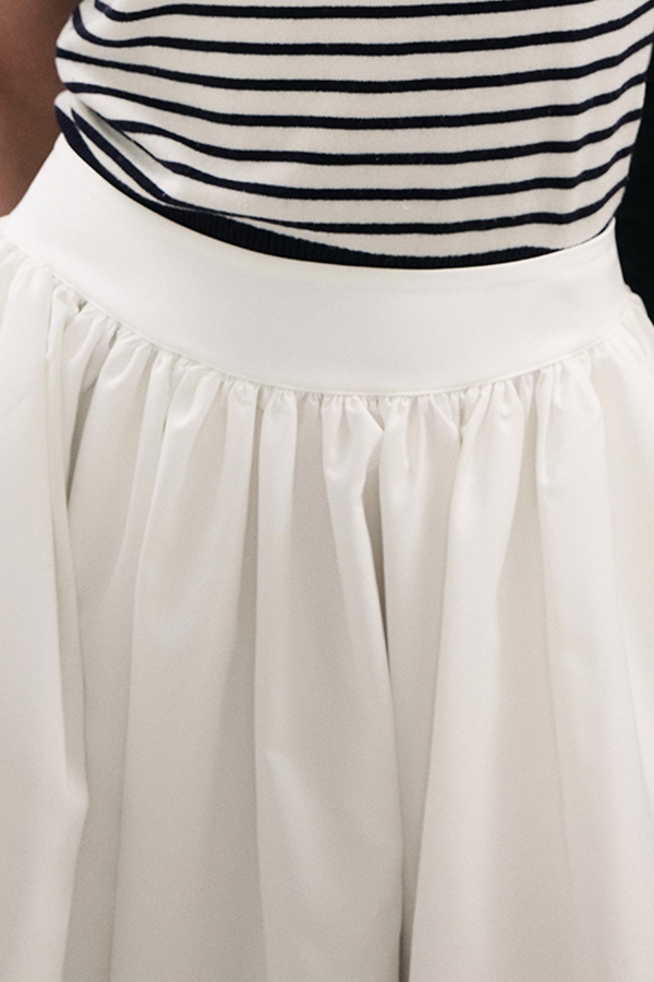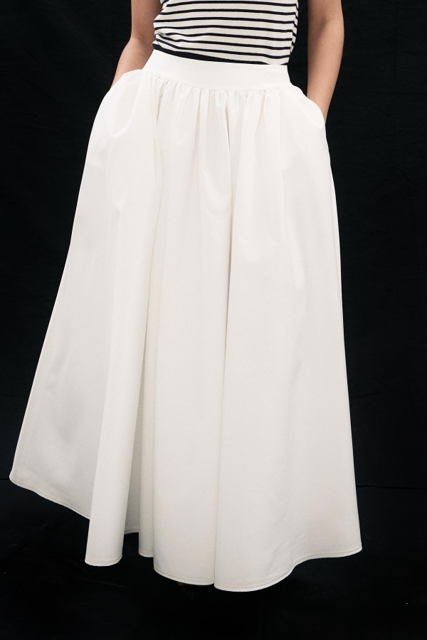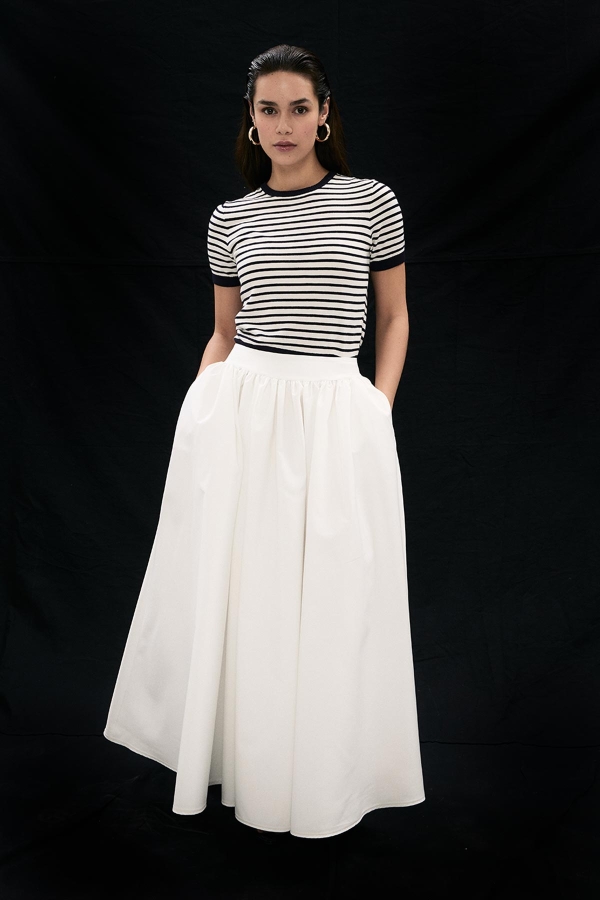 Orta bel, büzgülü, arkadan gizli fermuarlı, yanlardan cepli, premium telalanmış hacimli duran kumaştan iç belli etmeyen astarsız balon etek.