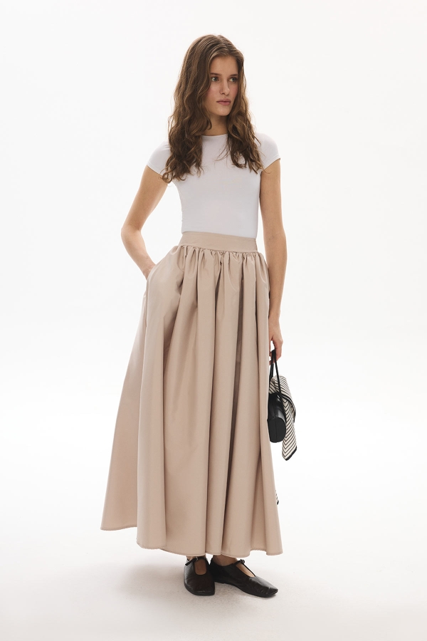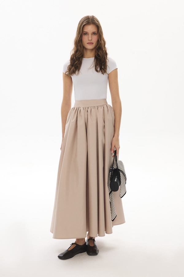 Orta bel, büzgülü, arkadan gizli fermuarlı, yanlardan cepli, premium telalanmış hacimli duran kumaştan iç belli etmeyen astarsız balon etek.