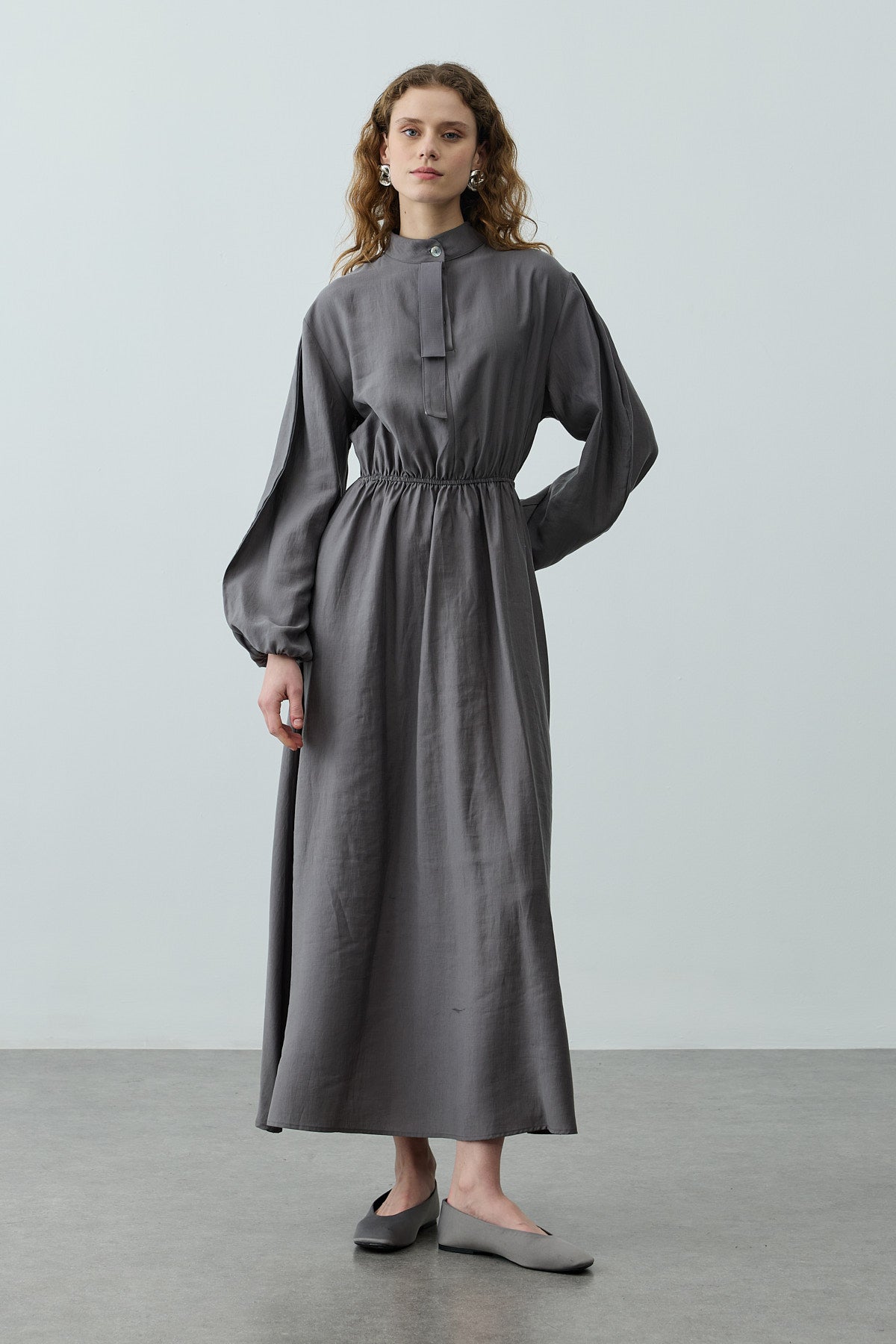Tensel dokuma kumaştan, hakim yakalı, önü düğme kapamalı, önü çıkarılabilir aksesuarlı, uzun balon kollu, maxi boy elbise.