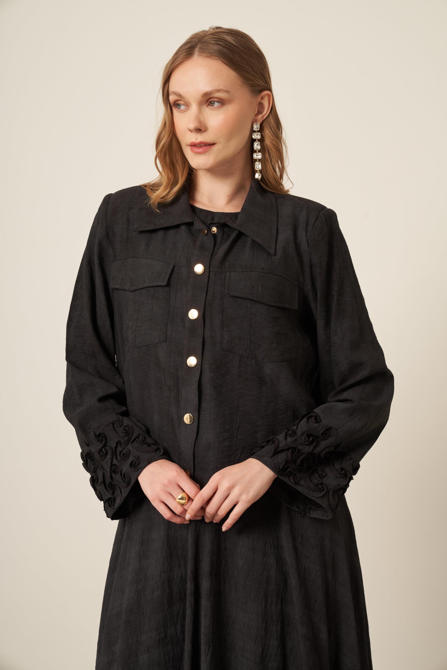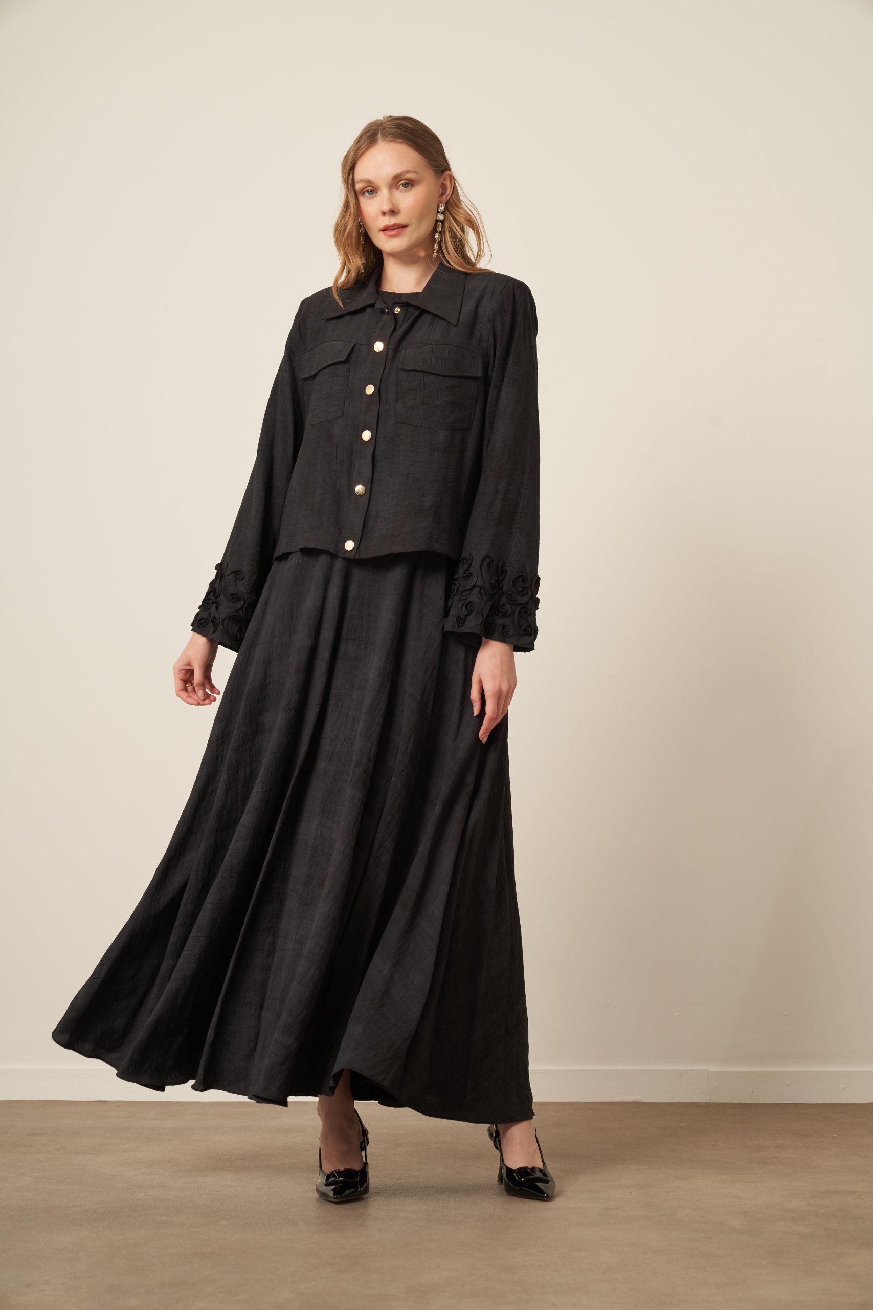 Tunik ve pantolonun uyumlu siluetiyle öne çıkan bu takım, aplike cep detaylarıyla sade tasarıma sofistike bir karakter kazandırır. Akıcı kumaşı gün boyu konfor sağlarken, modern çizgisi şehir stiline güçlü ama yalın bir dokunuş ekler.