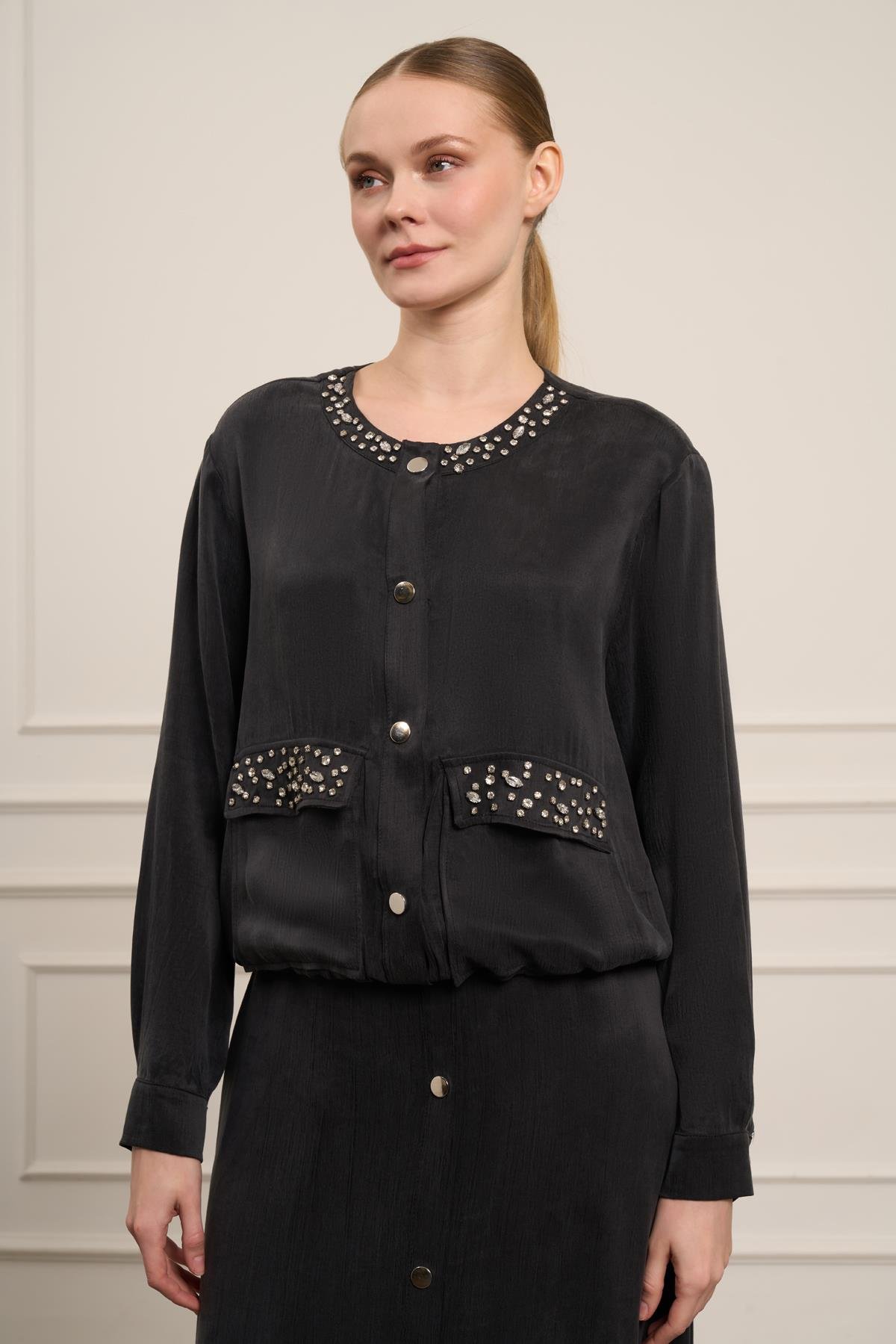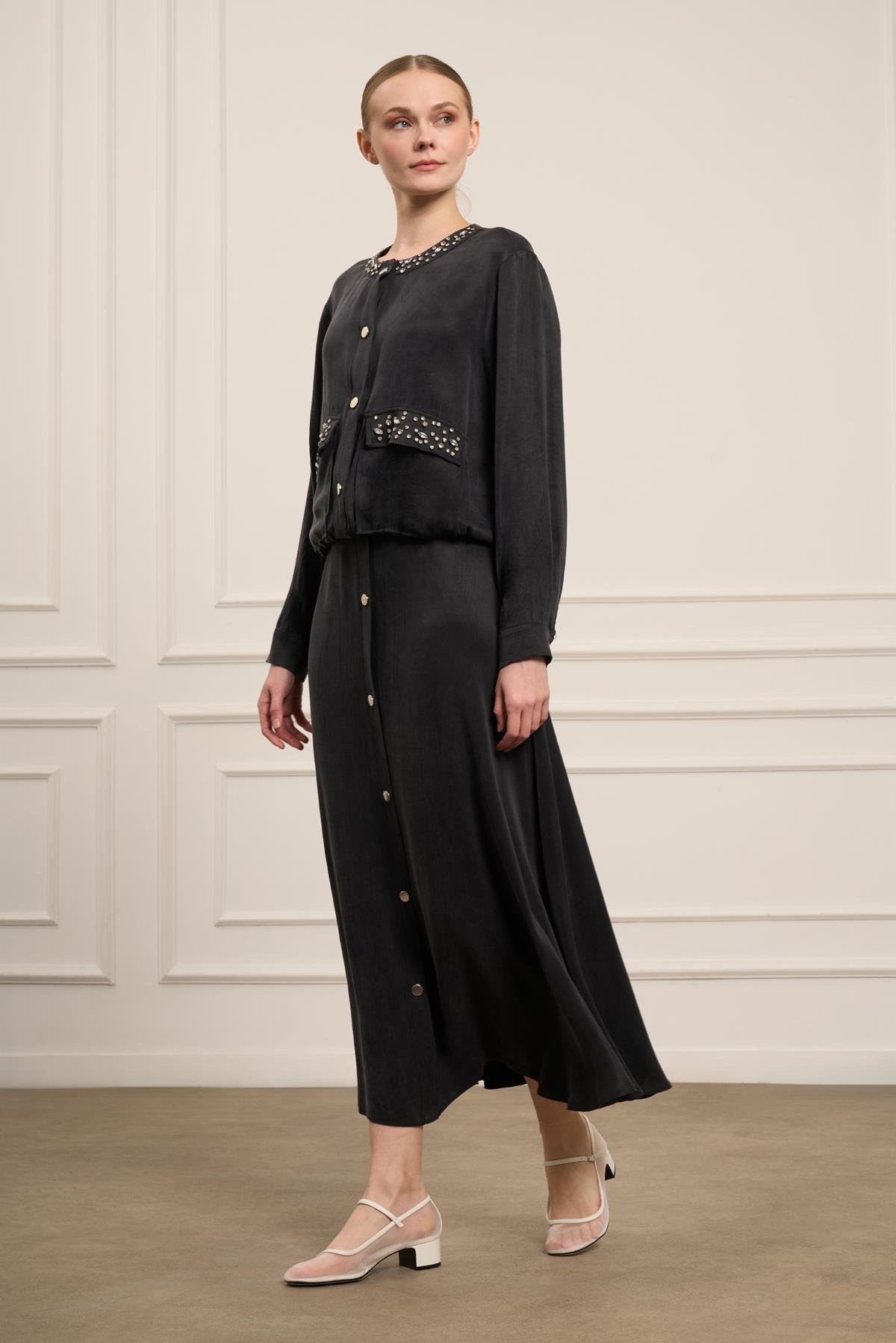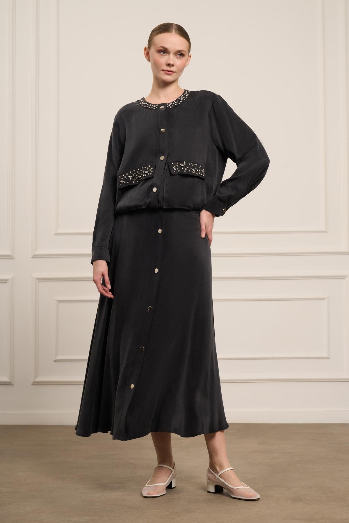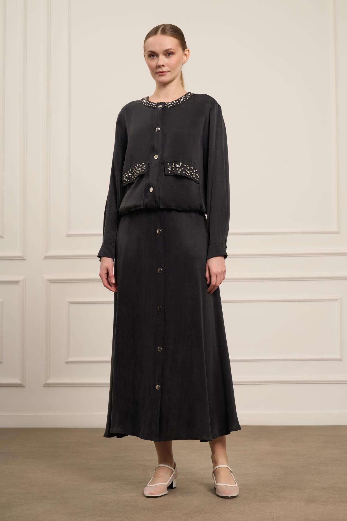 Tunik ve pantolonun uyumlu siluetiyle öne çıkan bu takım, aplike cep detaylarıyla sade tasarıma sofistike bir karakter kazandırır. Akıcı kumaşı gün boyu konfor sağlarken, modern çizgisi şehir stiline güçlü ama yalın bir dokunuş ekler.