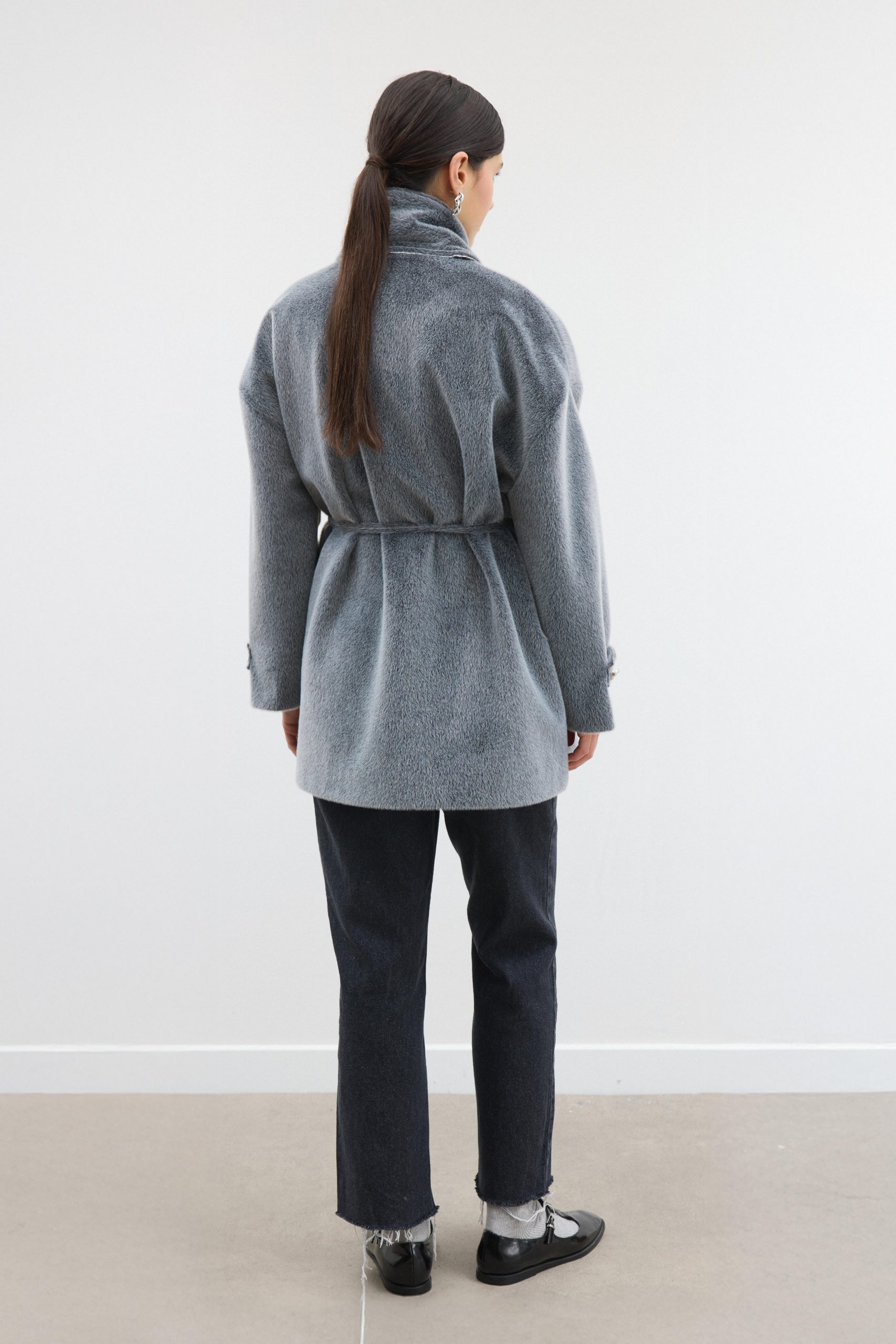 Gri Orta Boy Kemerli Crossover Palto 3754
