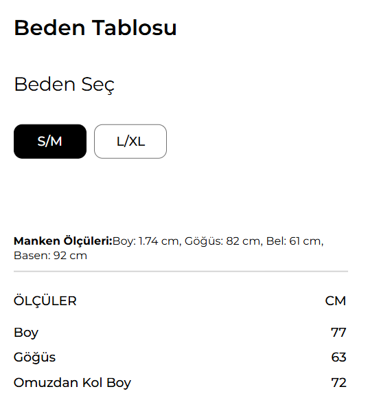 Uzunluk: 71 cm (Üretimler arasında ürün uzunluğu 1-5 cm değişiklik gösterebilir. Bu uzunluk ölçüsü ürün düz bir zemine yatırılarak alınmıştır. Örgü kumaşın doğası gereği, giyildiğinde aşağı doğru esner ve 5-8 cm daha uzun görünür.)