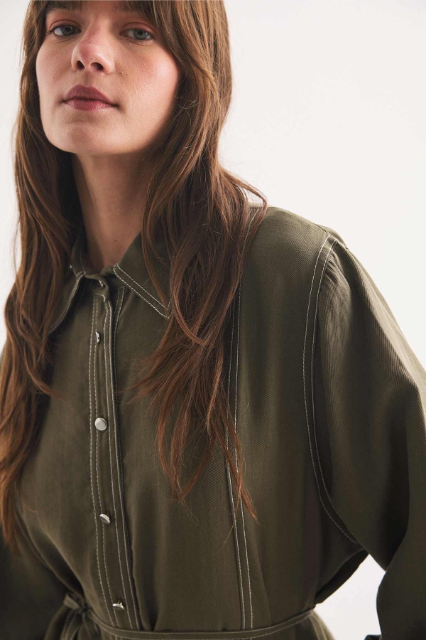 Gömlek yakalı, ön taraftan derin yırtmaç detaylı, cima dikişli, kendi kumaşında seyyar biye kemerli, rahat kesim gömlek.