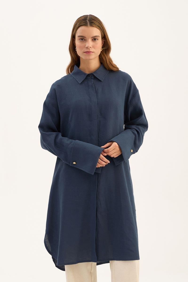 Geniş Manşetli %100 Keten Tunik Lacivert