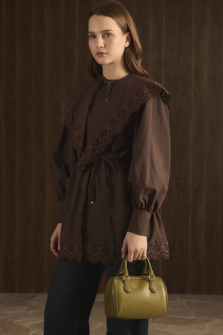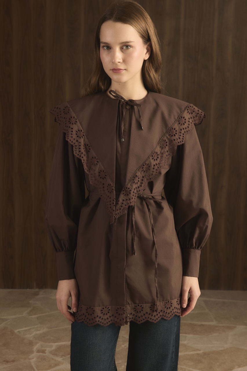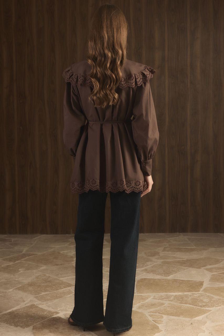 Geniş Yaka Güpürlü Dacron Gömlek – Kahve