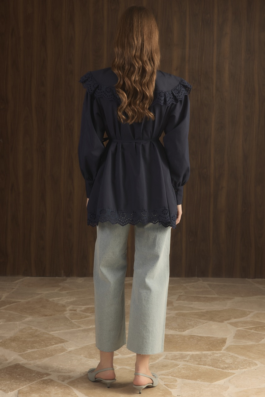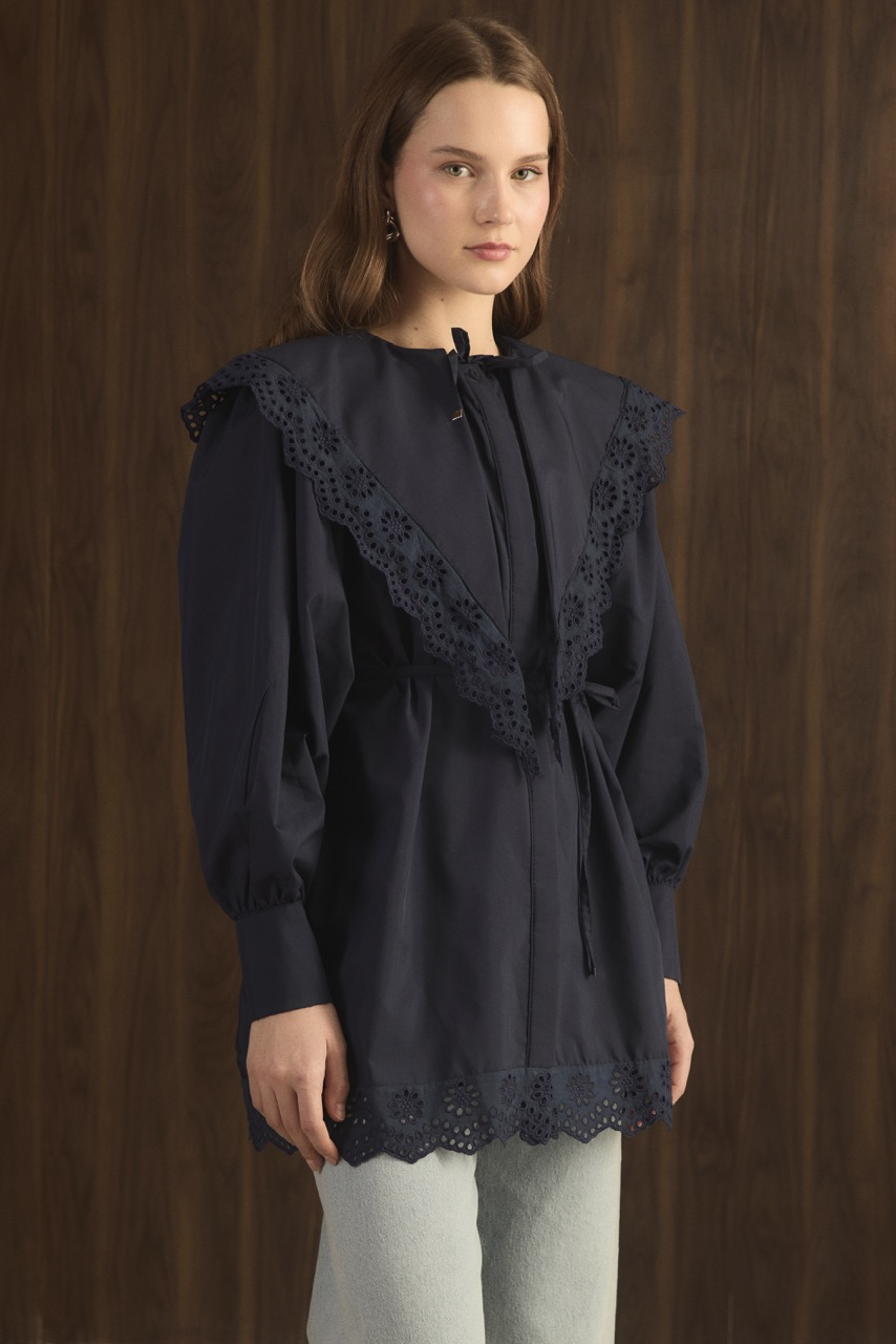 Geniş Yaka Güpürlü Dacron Gömlek – Lacivert