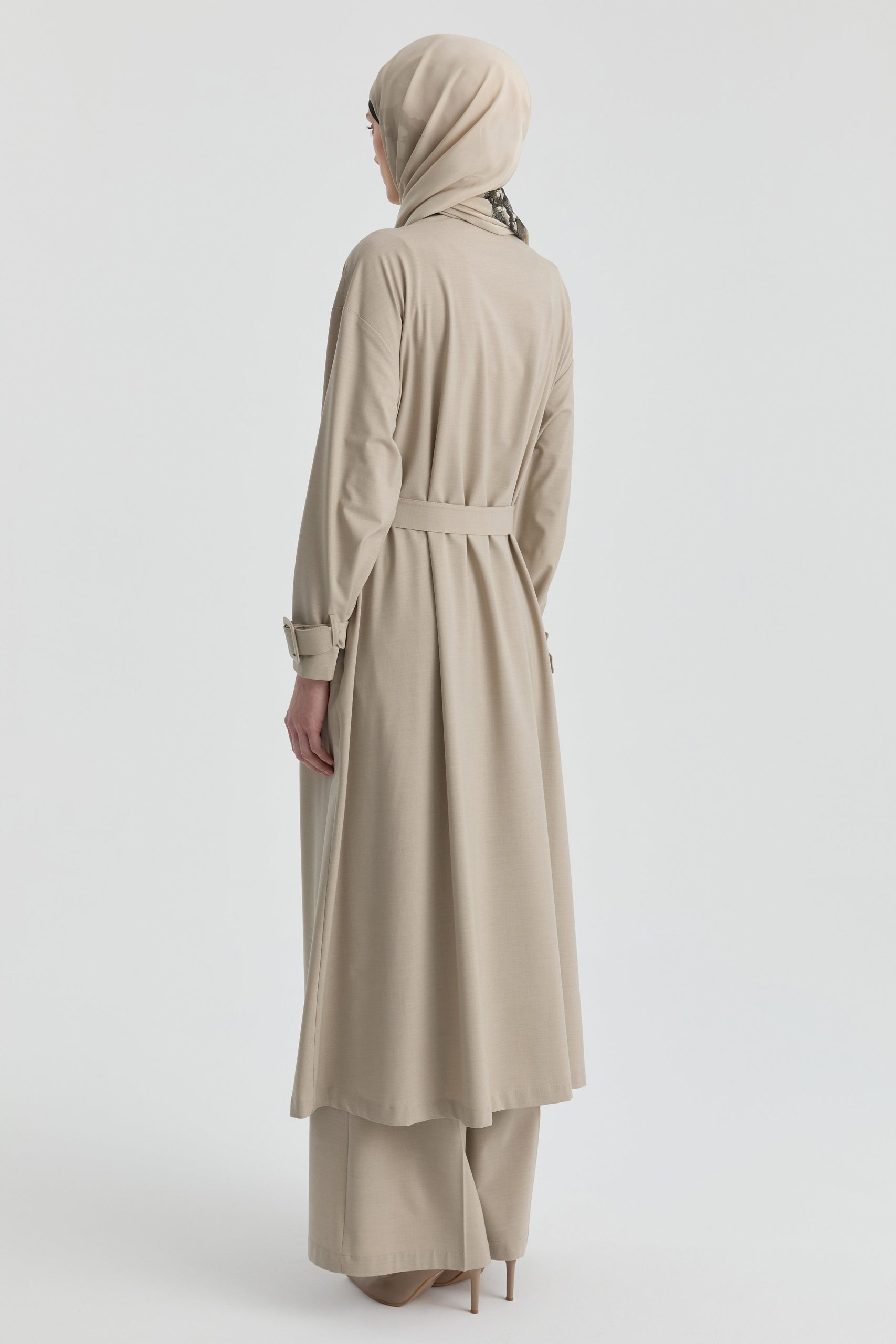Gizli pat detayıyla sade ve düzenli bir görünüm sunan bu ferace, temiz çizgileriyle zamansız bir duruş sergiler. Ön kapamadaki gizli yapı, parçaya bütünlüklü ve akıcı bir form kazandırır.