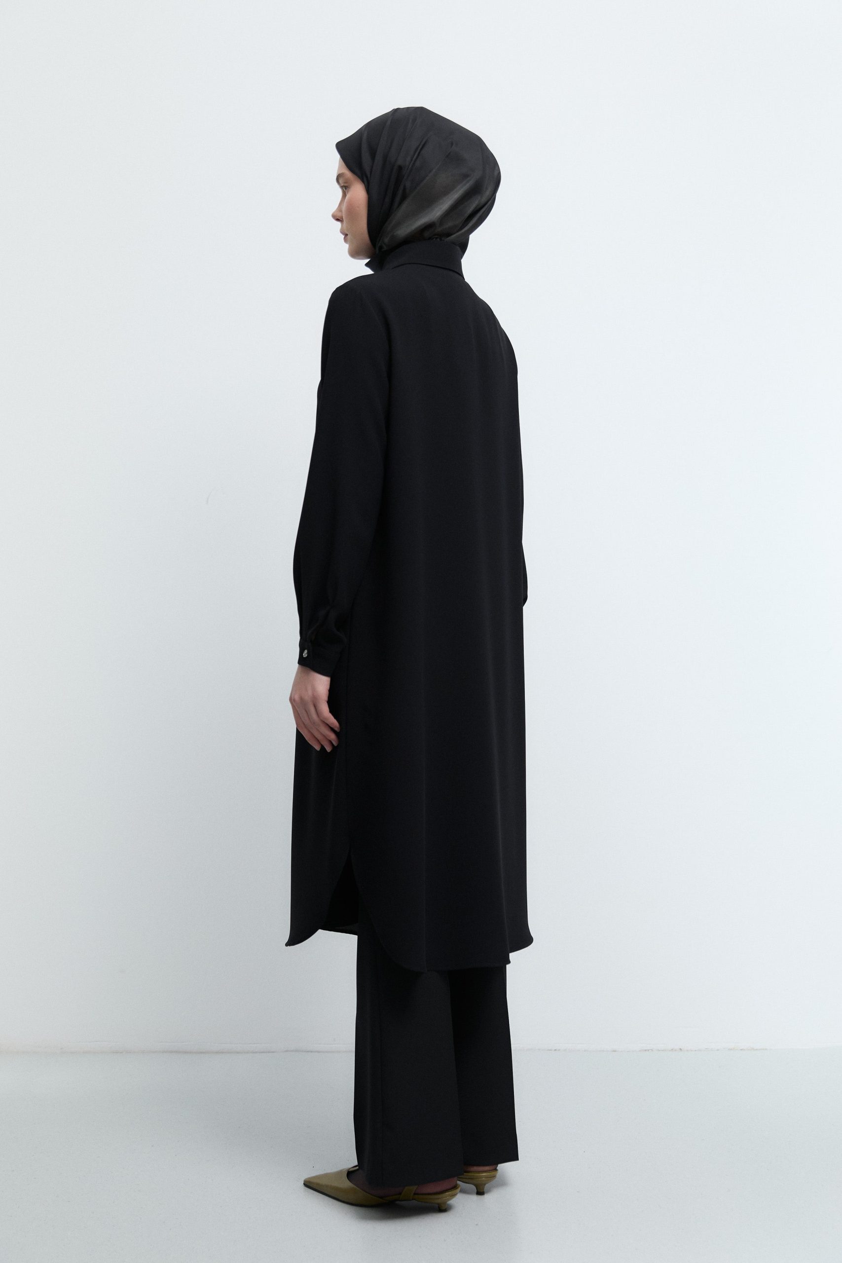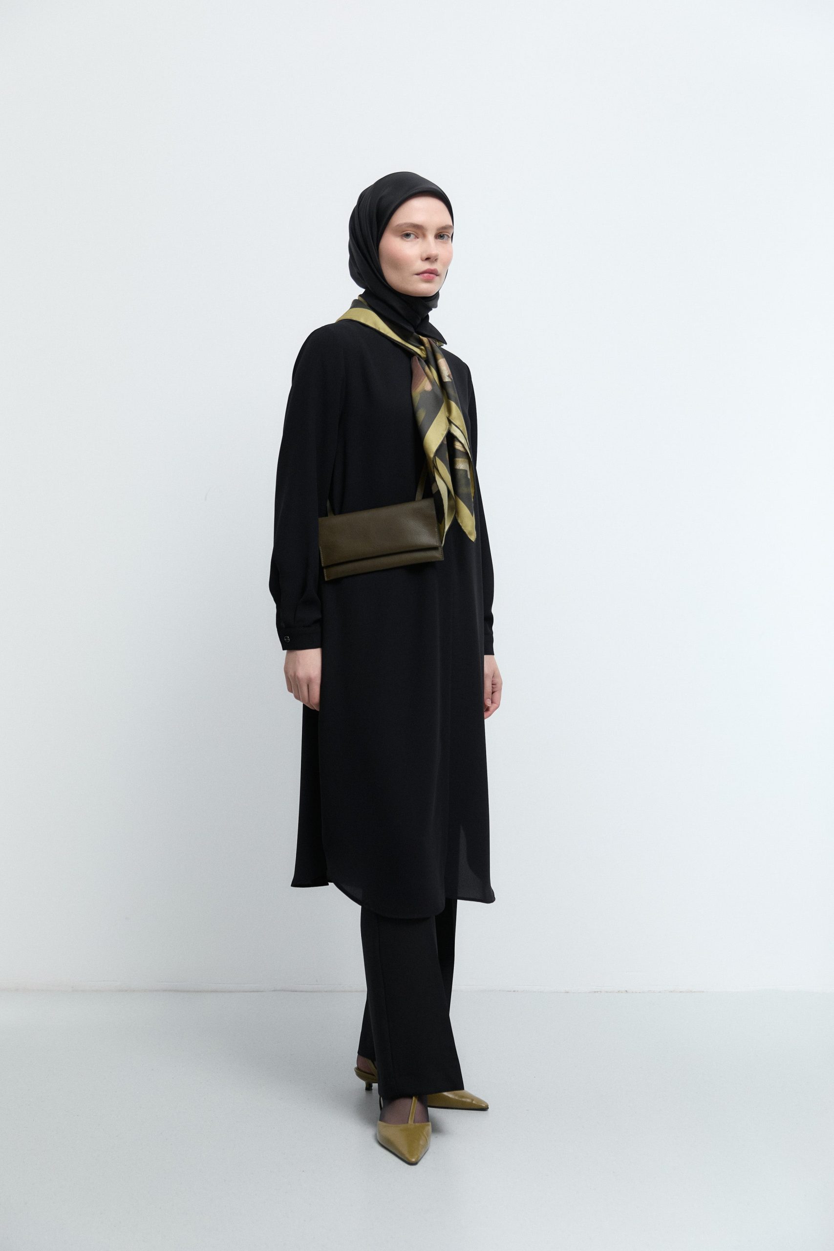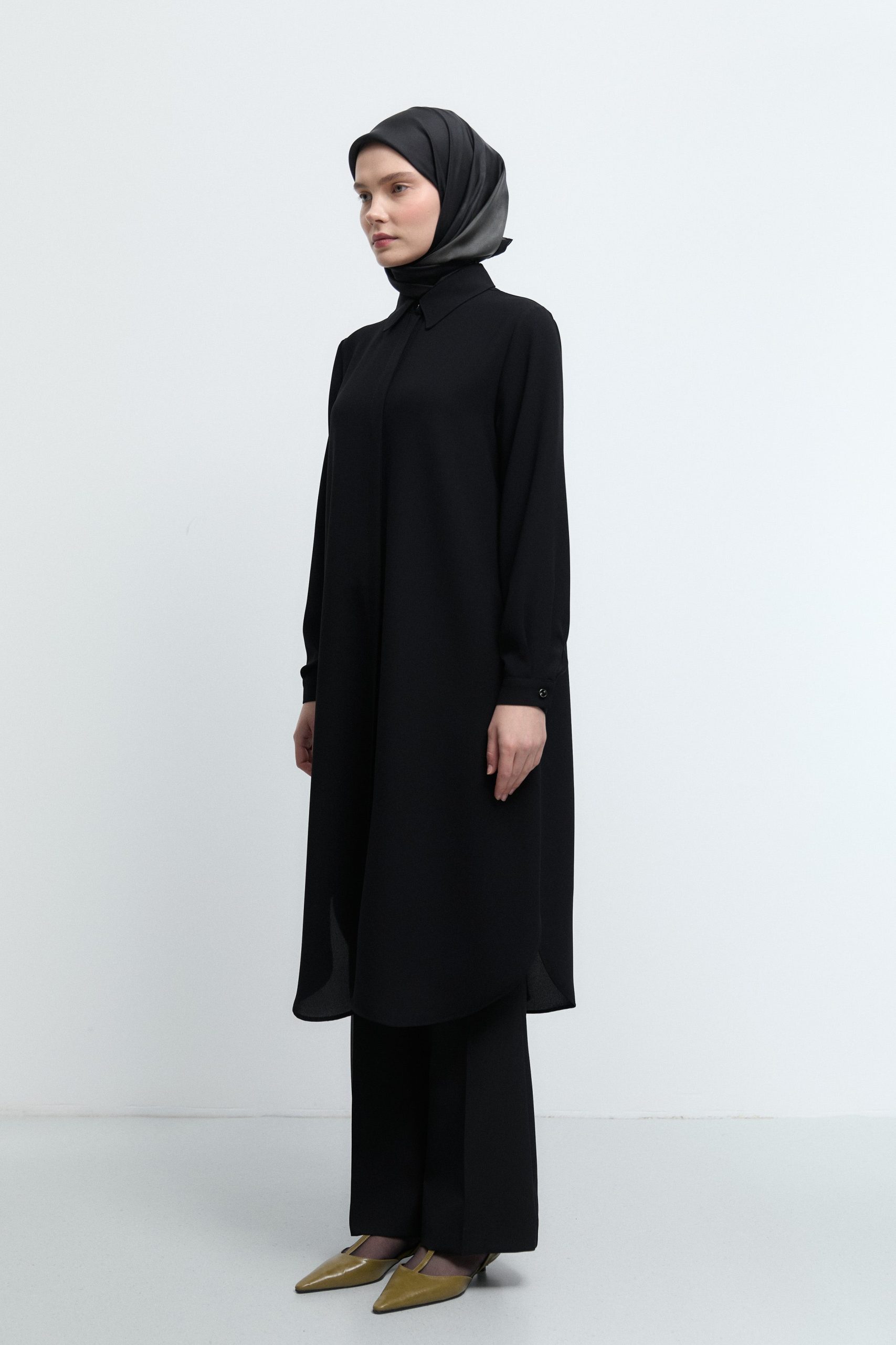Geniş manşetli uzun kolları ve yan yırtmaçları sayesinde hareket özgürlüğü sunan tunik, hem günlük kullanıma hem de özel gün kombinlerine uyum sağlar. Pantolonlar, dar paça taytlar veya uzun eteklerle kolayca kombinlenebilir. Zarif koyu yeşil tonu, pastel ve nötr renklerle mükemmel bir uyum yakalayarak stilinize romantik bir dokunuş katar.