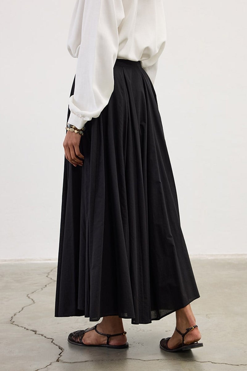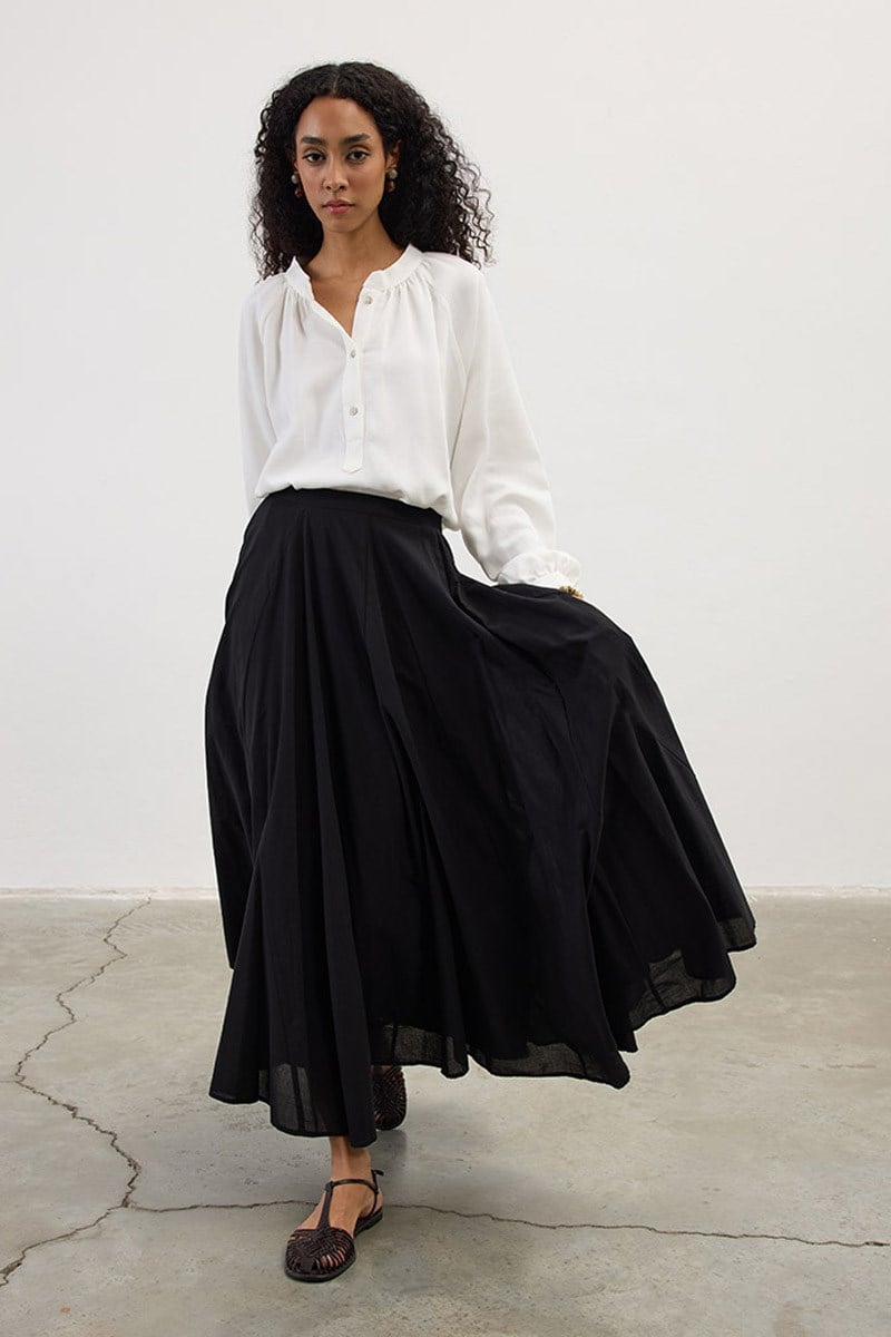 Orta bel, büzgülü, arkadan gizli fermuarlı, yanlardan cepli, premium telalanmış hacimli duran kumaştan iç belli etmeyen astarsız balon etek.