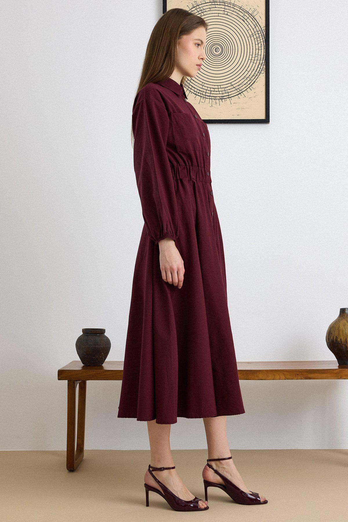 Göğüs Cepli Beli Lastikli Poplin Elbise BORDO 9286-E