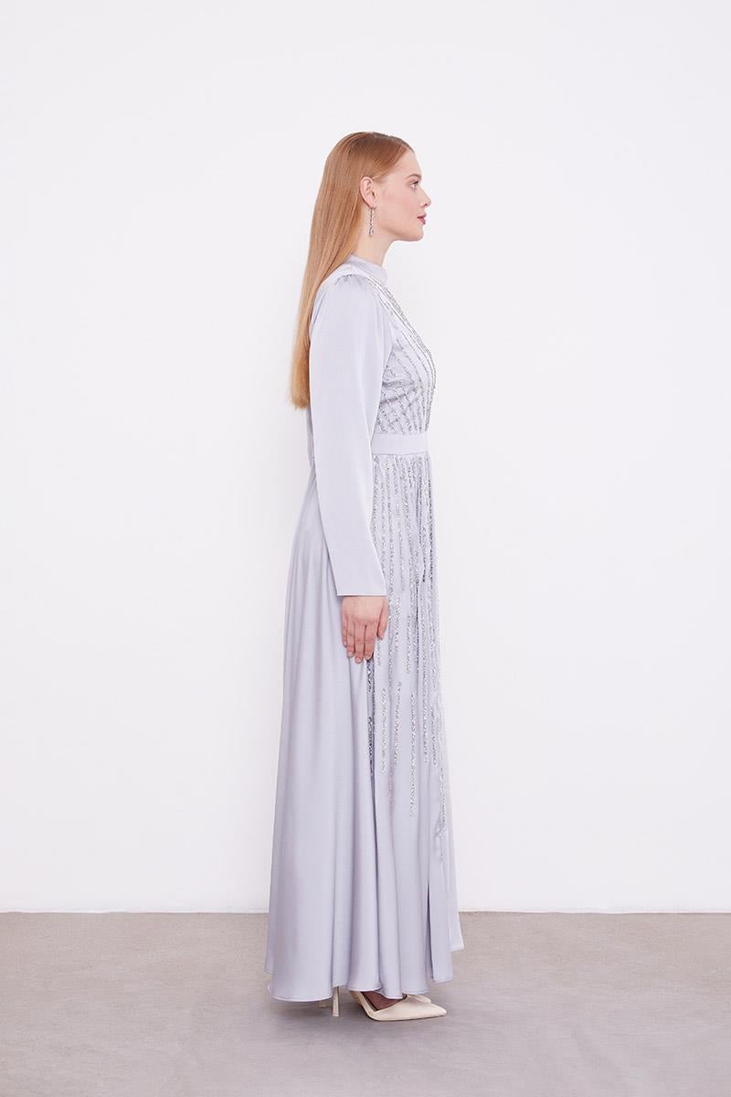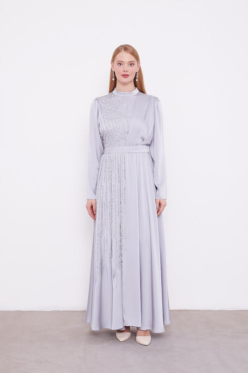 Gri Bel Kemerli Taşlı Elbise