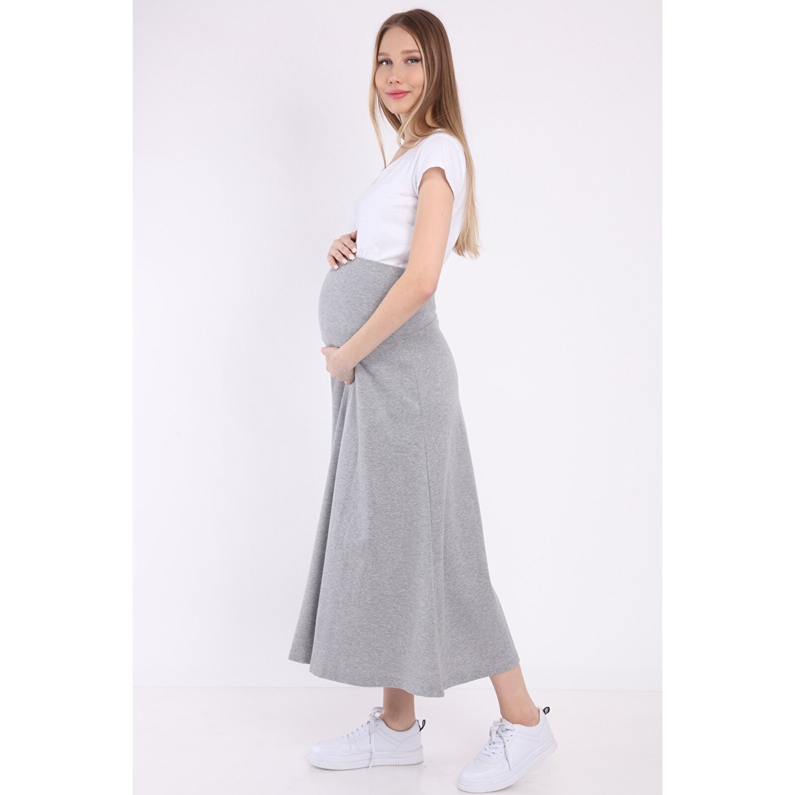 GRİ Beli Ayarlı Lastikli Kadın Uzun Hamile Etek