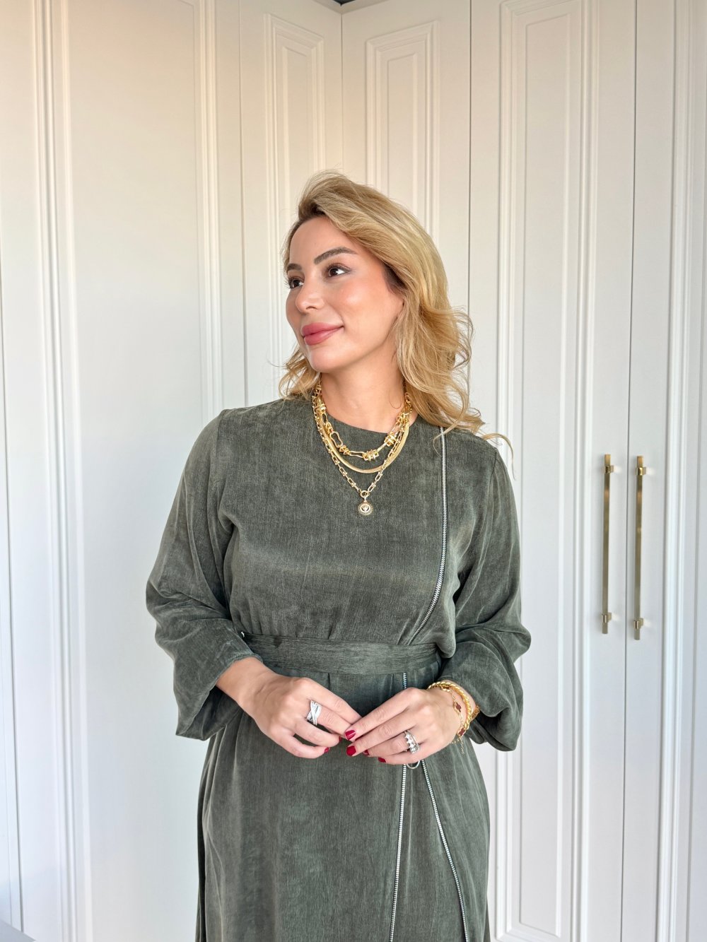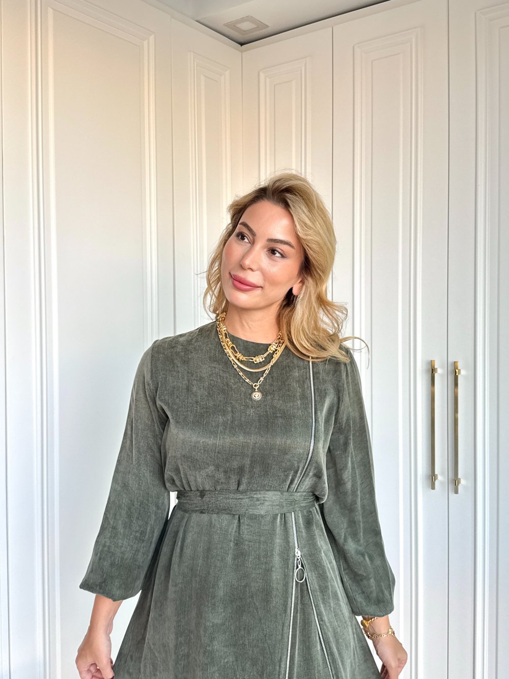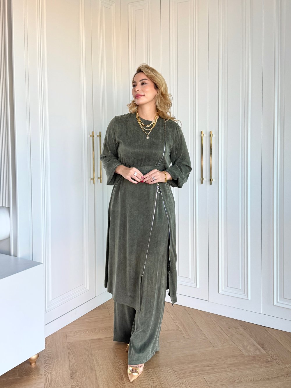 Tunik ve pantolonun uyumlu siluetiyle öne çıkan bu takım, aplike cep detaylarıyla sade tasarıma sofistike bir karakter kazandırır. Akıcı kumaşı gün boyu konfor sağlarken, modern çizgisi şehir stiline güçlü ama yalın bir dokunuş ekler.