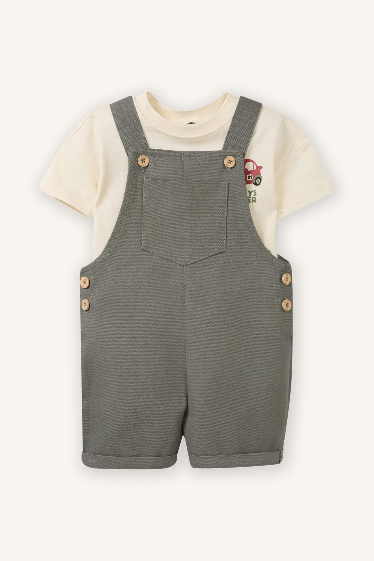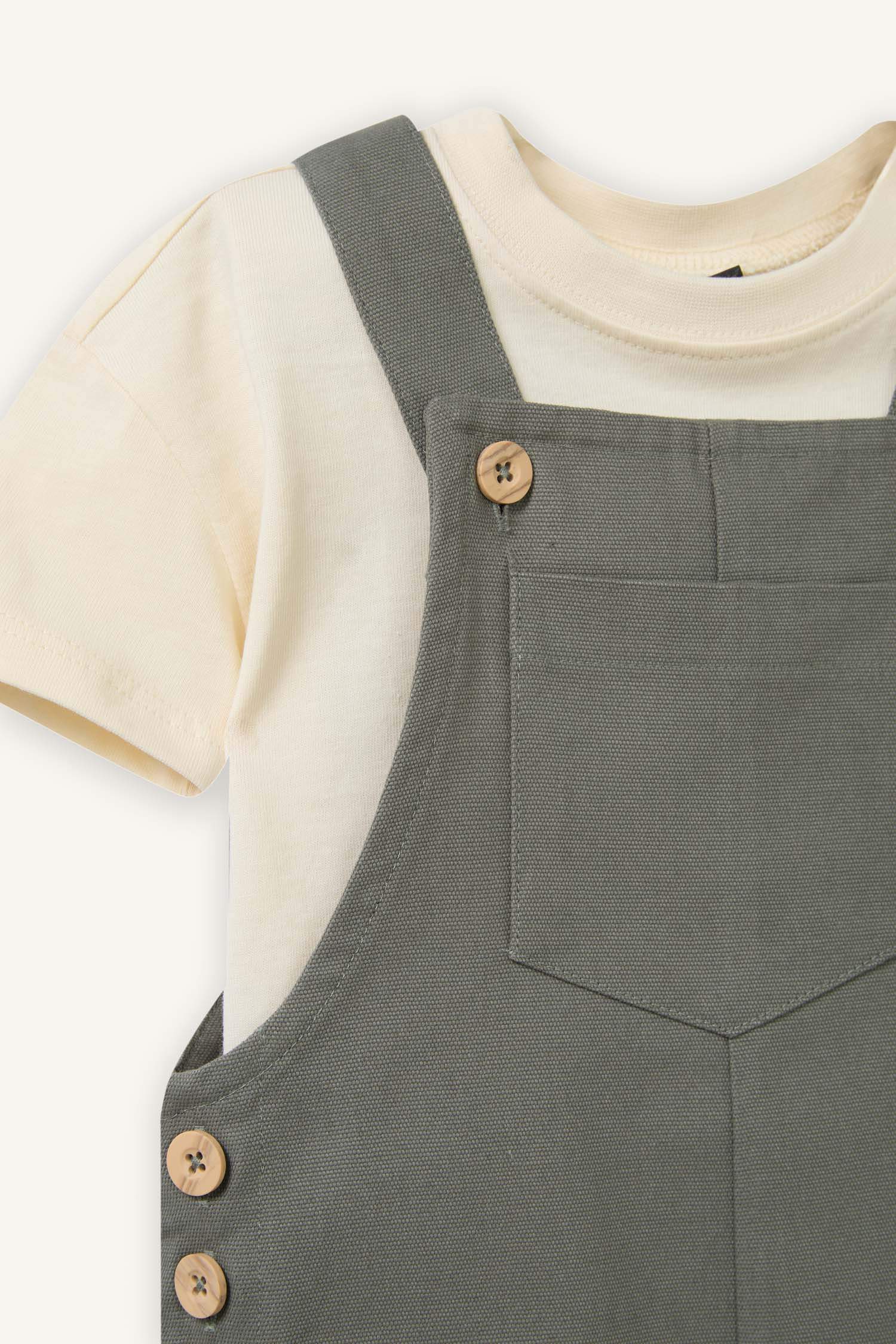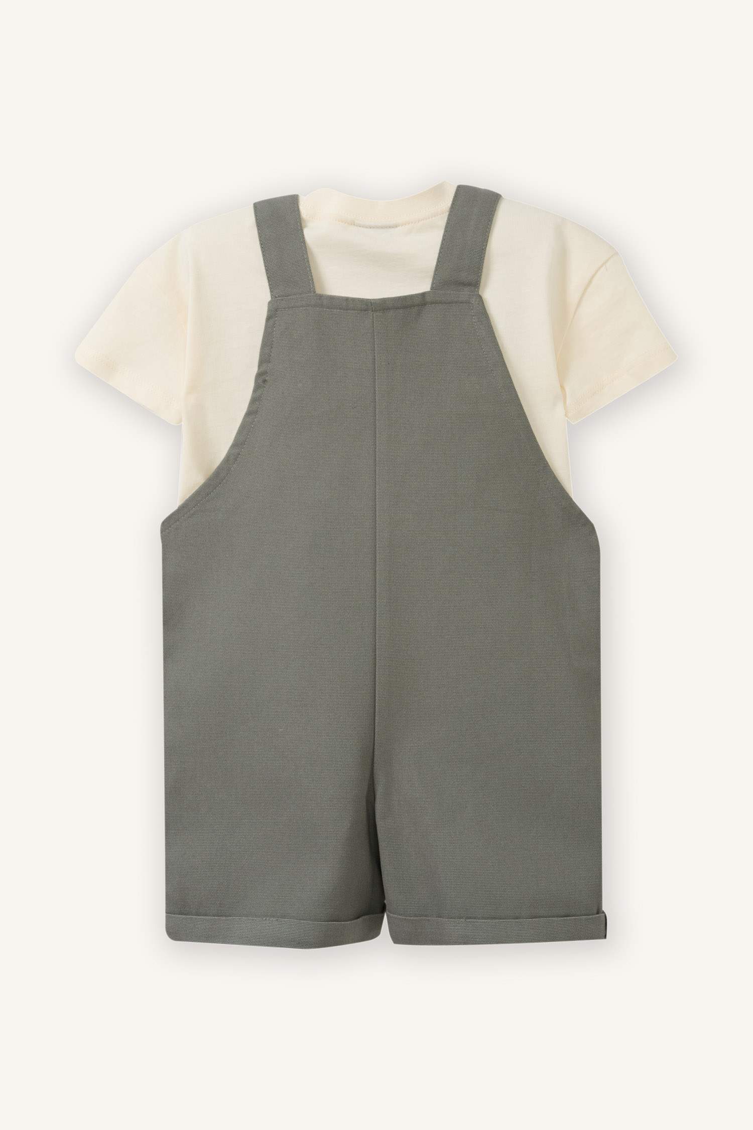 Bebekler için şık ve rahat 2 parçalı takım; yumuşak krem rengi kısa kollu tişört ve ayarlanabilir askılı tulumdan oluşur. Nefes alabilen kumaşı sayesinde miniklerin gün boyu konforunu sağlar.