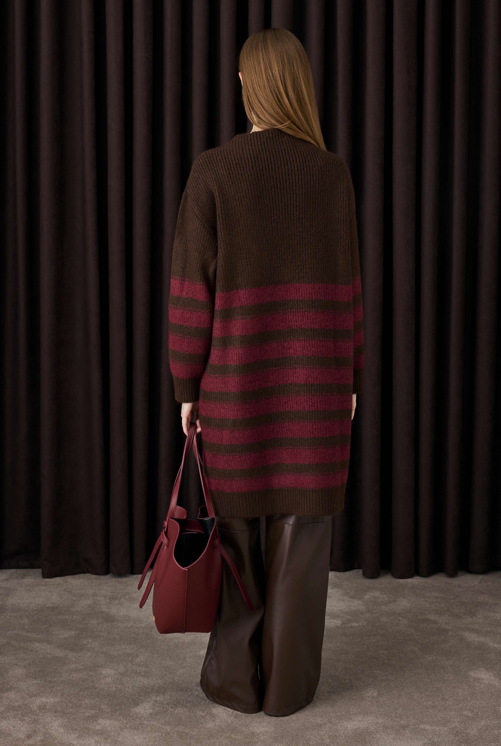 İnce Çizgili Uzun Kazak Kahve-Bordo