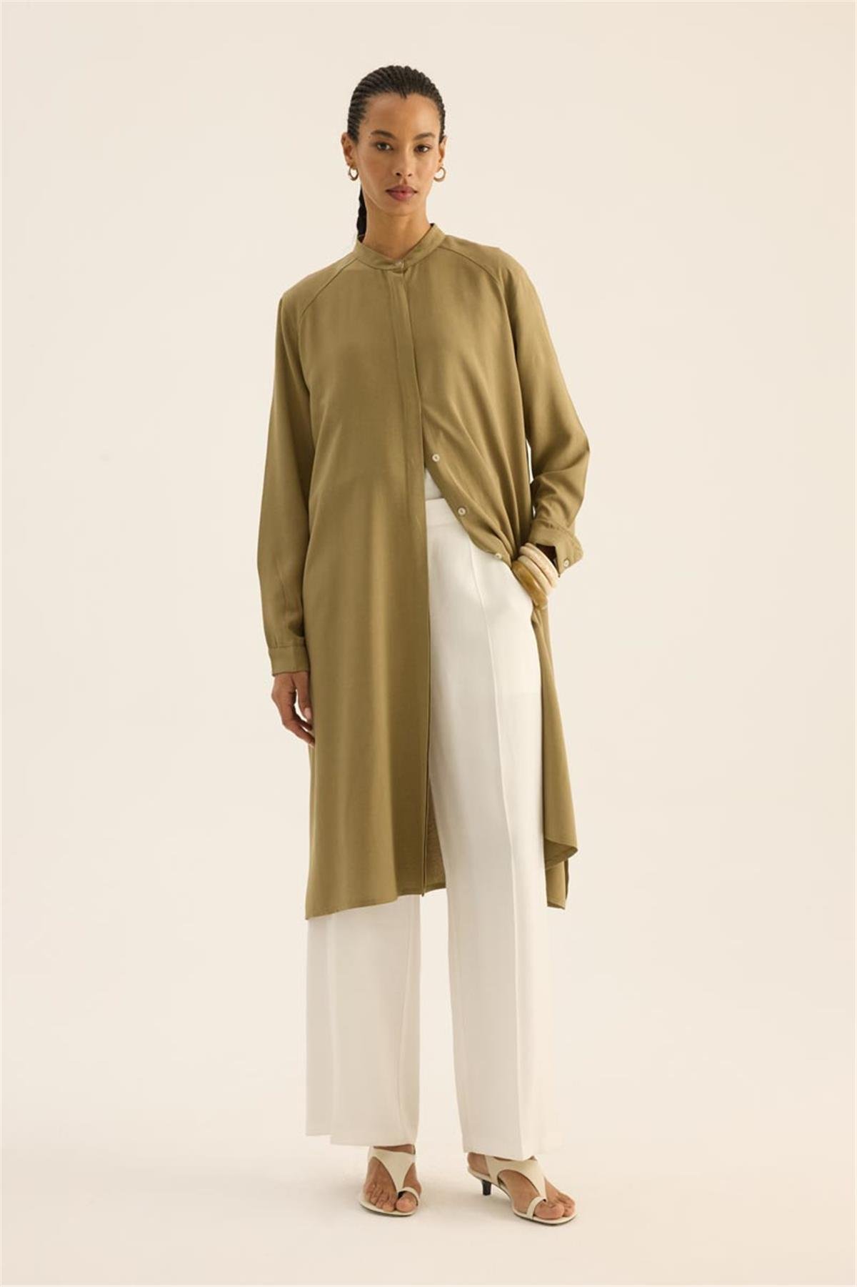 Geniş manşetli uzun kolları ve yan yırtmaçları sayesinde hareket özgürlüğü sunan tunik, hem günlük kullanıma hem de özel gün kombinlerine uyum sağlar. Pantolonlar, dar paça taytlar veya uzun eteklerle kolayca kombinlenebilir. Zarif koyu yeşil tonu, pastel ve nötr renklerle mükemmel bir uyum yakalayarak stilinize romantik bir dokunuş katar.