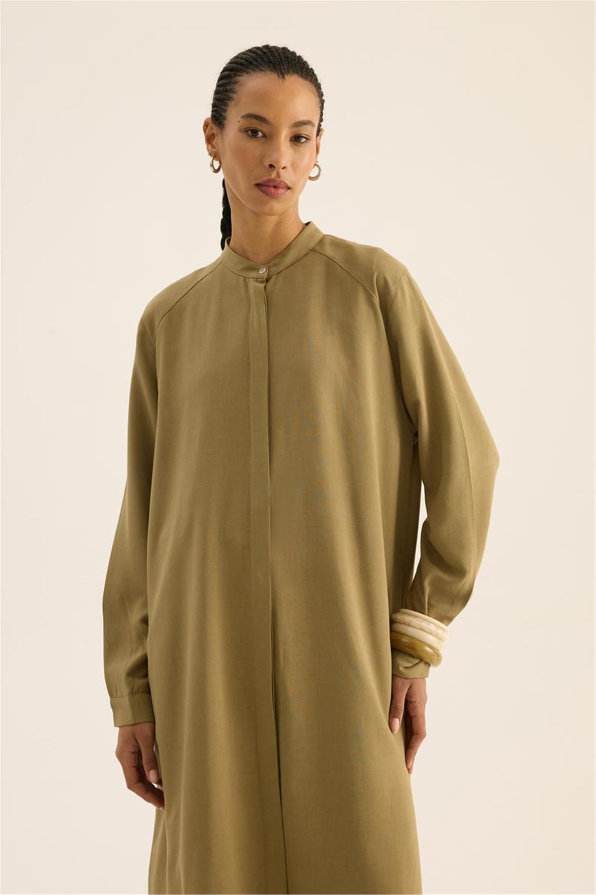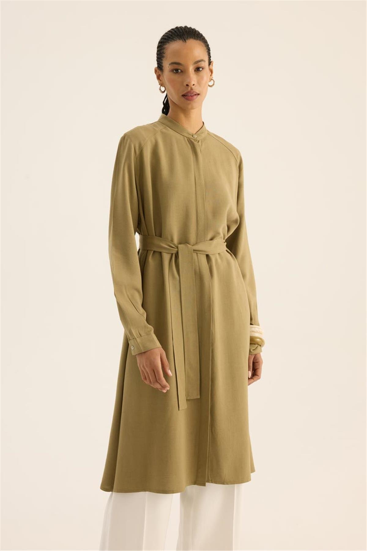 Doğal dokusu ve zarif çizgileriyle öne çıkan bu koyu yeşil rengi uzun tunik, yaz sezonunun ferah ve şık parçalarından biri. %88 Tencel ve %12 Pes karışımıyla üretilen kumaşı, hafiflik ve yumuşaklık sunarken nefes alabilir yapısıyla sıcak havalarda konfor sağlar. İnce çizgili dokusu modern bir görünüm kazandırırken, belde yer alan kendi kumaşından kuşak detayı ile vücuda uyumlu bir form oluşturur.