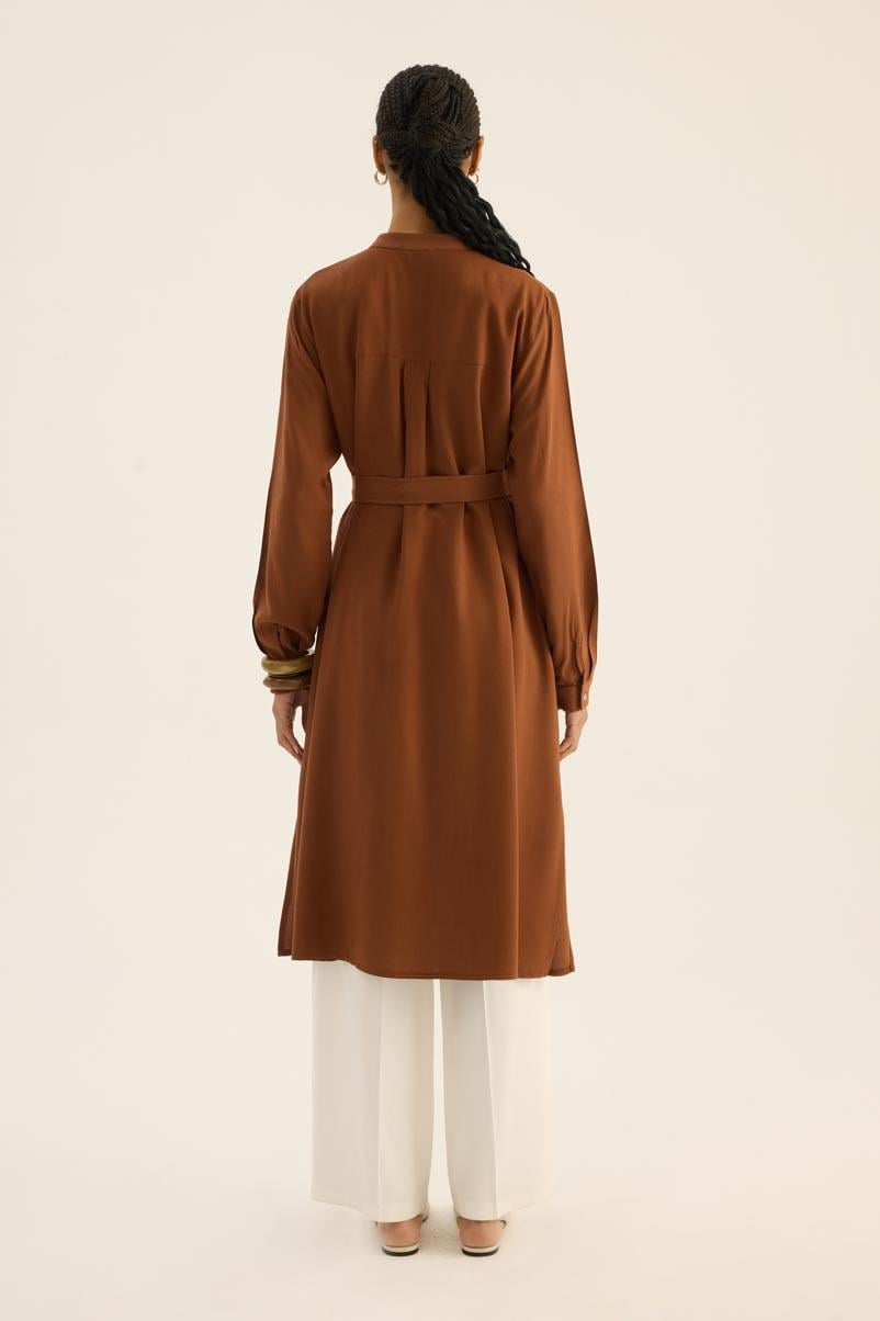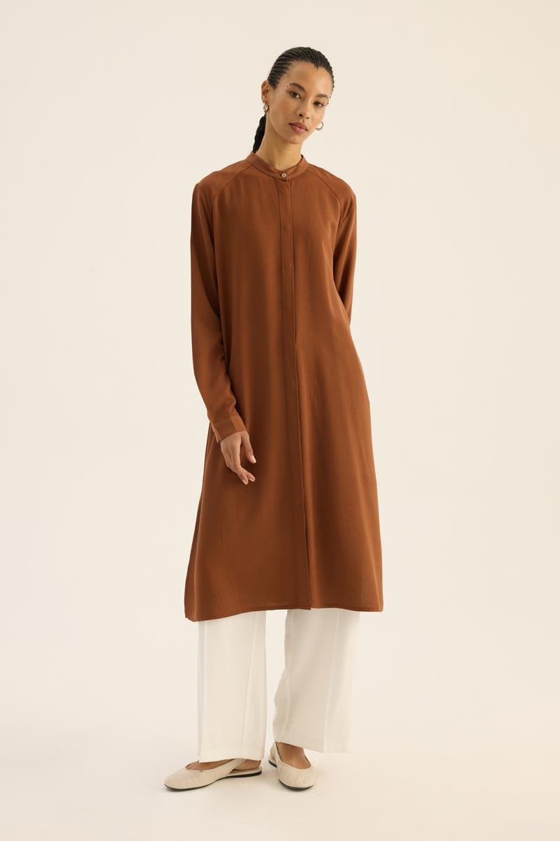 Doğal ve ferah bir görünüm sunan pudra rengi uzun tunik, yaz sezonunun hafif ve şık parçalarından biri. %88 Tencel ve %12 Pes karışımından üretilen kumaşı, yumuşak dokusu ve nefes alabilir yapısıyla gün boyu konfor sağlar. Minimal tasarımı, gizli patlı düğme detayı ve eteğinde yer alan zarif kavis kesimi ile modern bir duruş sergiler. Geniş manşetli uzun kolları ve rahat kesimi sayesinde hareket özgürlüğü sunan tunik, hem günlük kombinlerde hem de ofis şıklığında rahatlıkla tercih edilebilir. Nötr ve pastel tonlardaki pantolonlarla mükemmel uyum sağlar, aynı zamanda topuklu sandaletler veya düz ayakkabılarla farklı stillere uyarlanabilir. Zarif pudra tonu ile gardırobunuza taze ve huzurlu bir dokunuş katar.