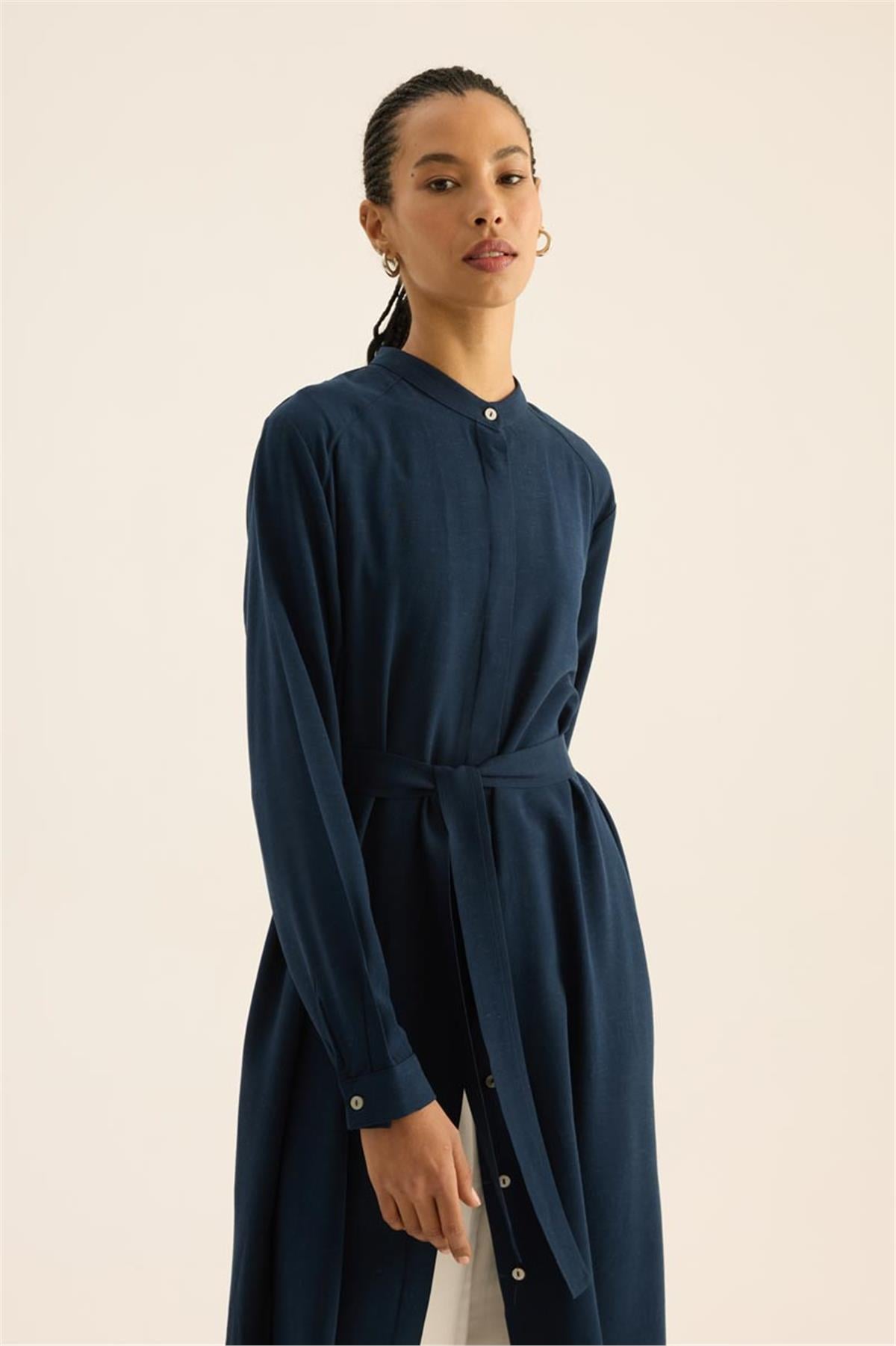 Doğal dokusu ve zarif çizgileriyle öne çıkan bu koyu yeşil rengi uzun tunik, yaz sezonunun ferah ve şık parçalarından biri. %88 Tencel ve %12 Pes karışımıyla üretilen kumaşı, hafiflik ve yumuşaklık sunarken nefes alabilir yapısıyla sıcak havalarda konfor sağlar. İnce çizgili dokusu modern bir görünüm kazandırırken, belde yer alan kendi kumaşından kuşak detayı ile vücuda uyumlu bir form oluşturur.