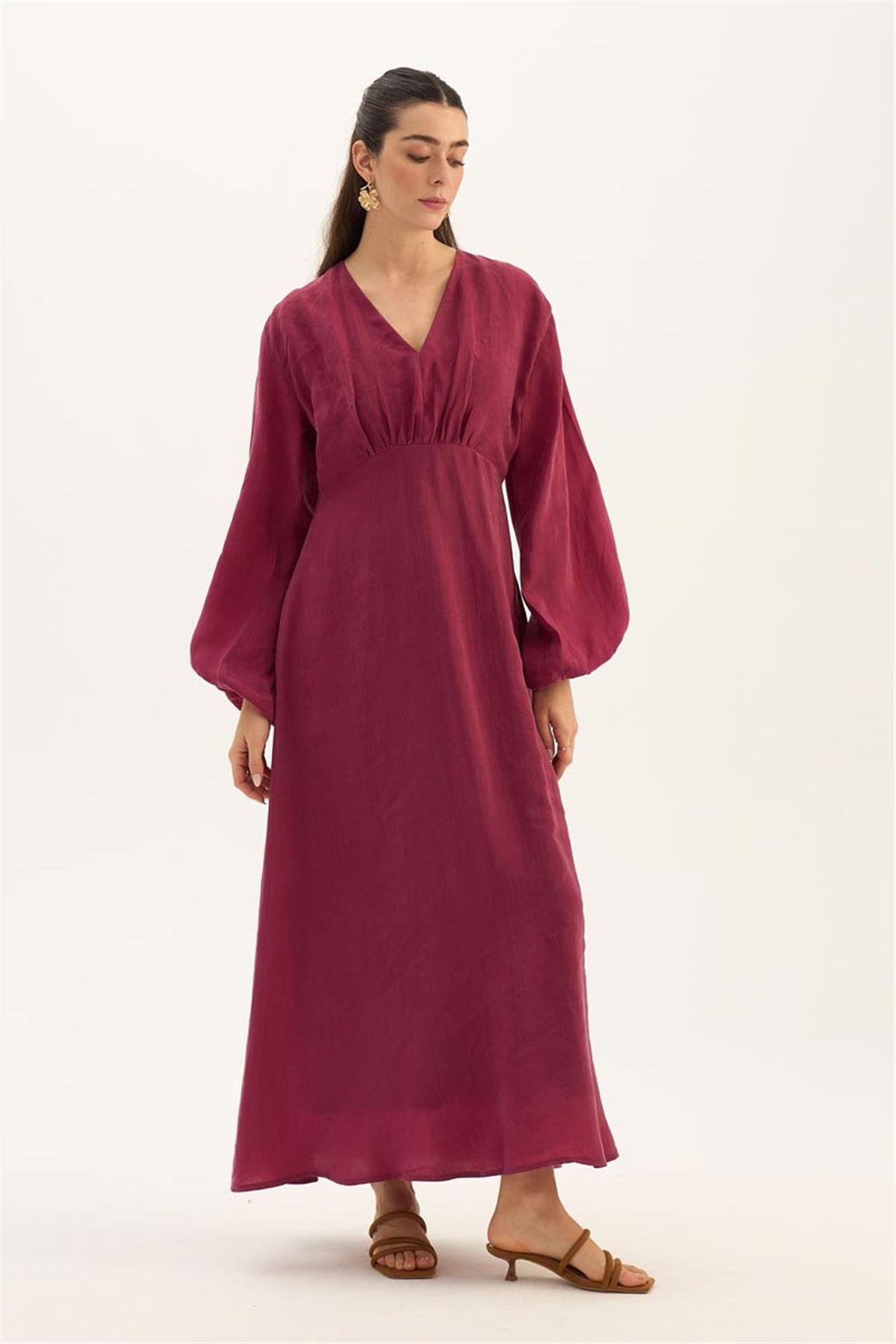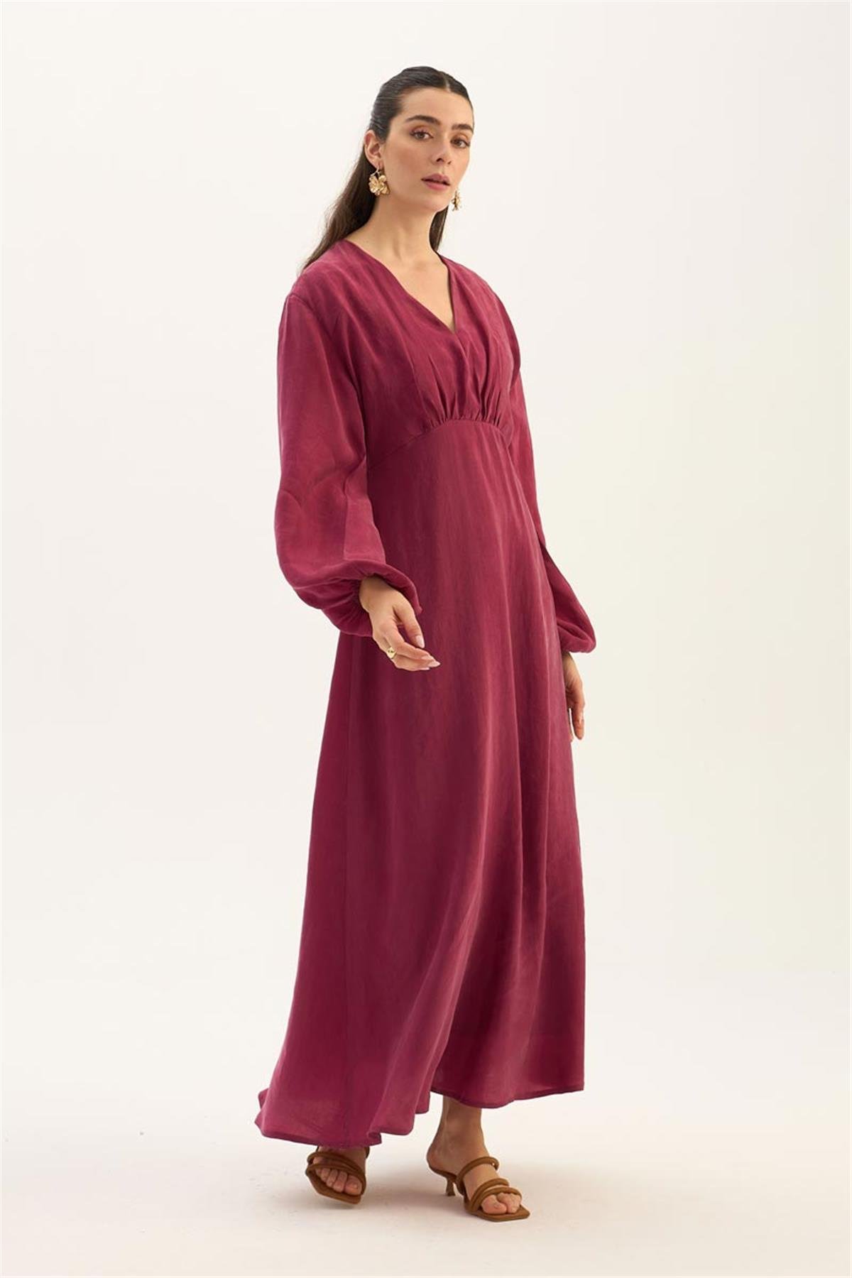 Fuşya tonunun doğal ışıltısı, bu elbiseyi gündüzden geceye taşıyabilecek şık bir seçenek haline getirir. Düz sandaletler veya topuklu ayakkabılarla rahatça kombinlenebilir. Minimal aksesuarlarla sade, iddialı parçalarla ise daha göz alıcı bir stil yaratmak mümkündür.