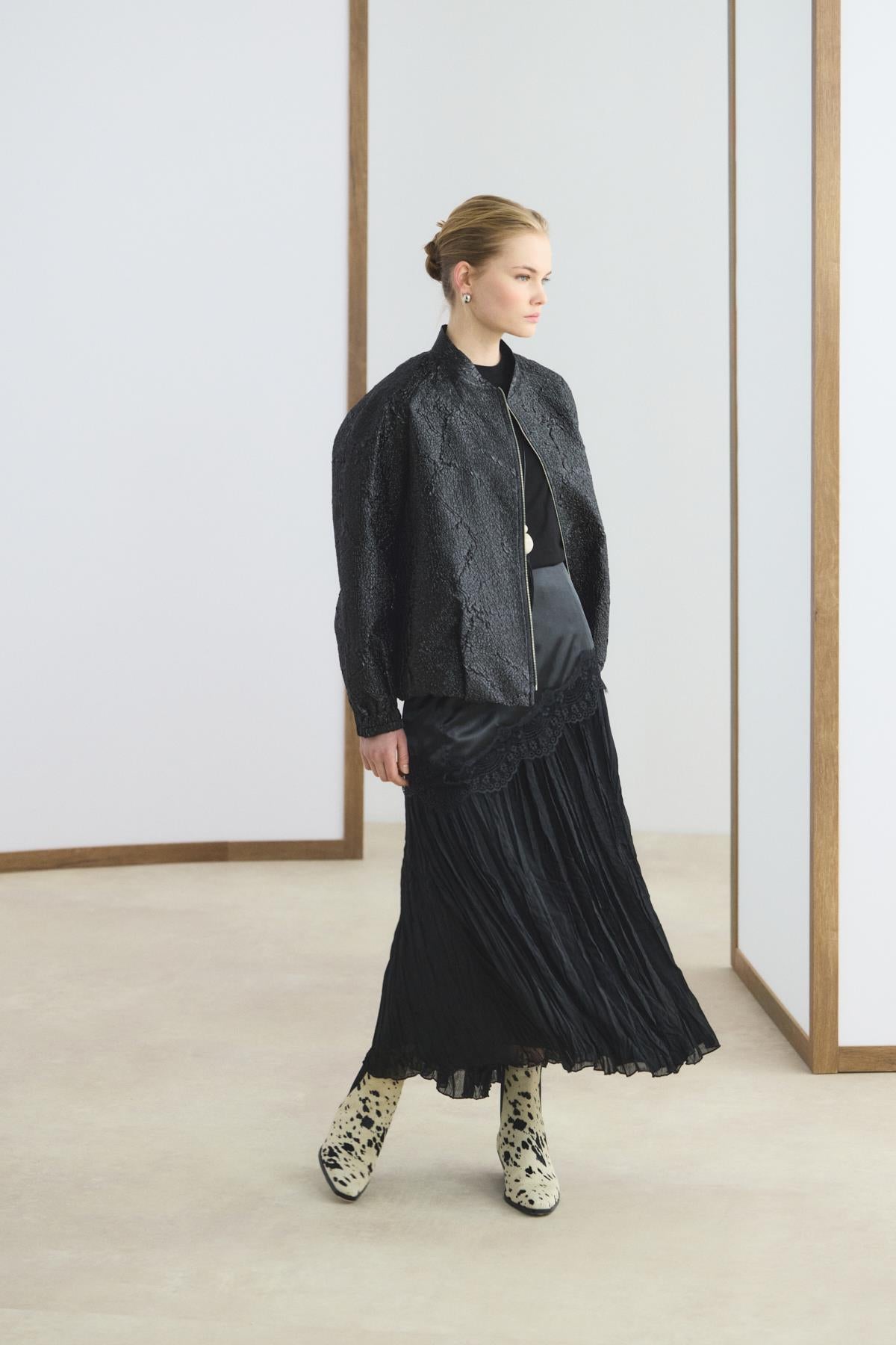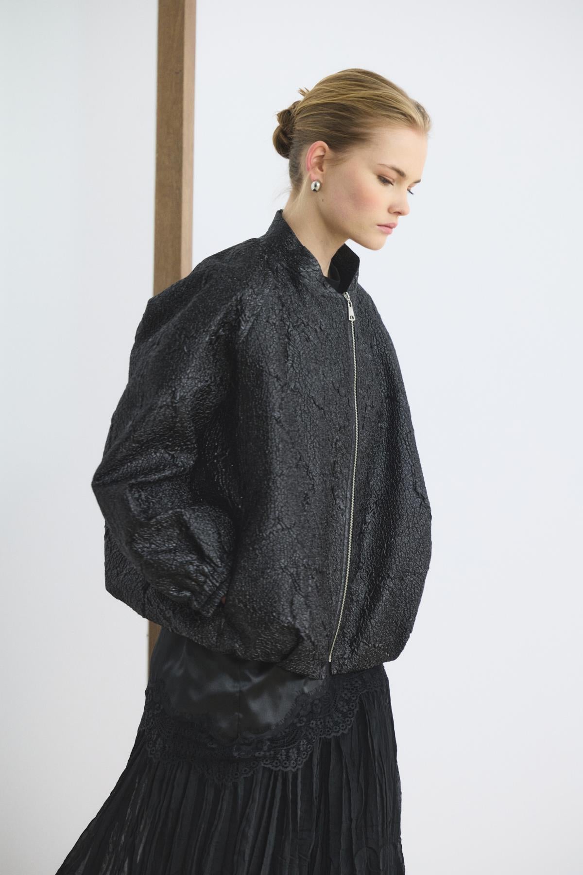 Jakar Balon Form İnce Bomber Ceket Siyah, özel dokuma jakar kumaşının zenginliği ve modern balon kol tasarımıyla stilinize derinlik katıyor. Hakim yaka ve reglan kesimin yarattığı özgün hacim; büzgülü etek ucu ve lastikli detaylarla birleşerek dinamik bir kullanım konforu sağlıyor. Hafif yapısı ve şık duruşuyla, her ortamda size eşlik edecek bir parça olmaya aday.