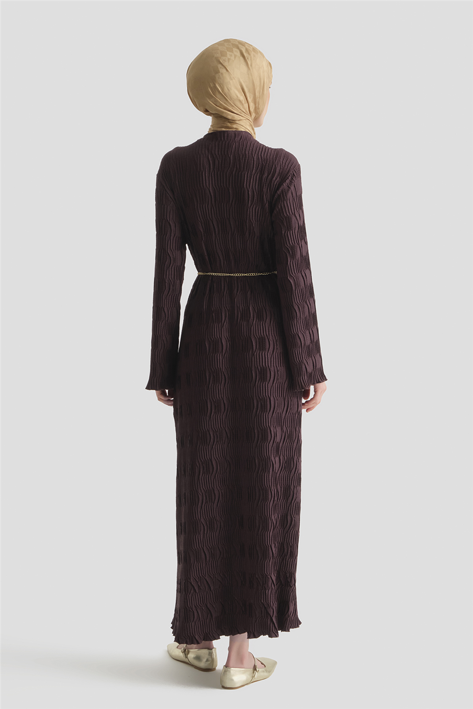 Zarif jakarlı dokusu ve kusursuz örme formuyla öne çıkan bu elbise, sade şıklığı sofistike bir duruşla yorumlar. Akıcı silueti ve dengeli kesimiyle modern, zamansız ve premium bir stil sunar.