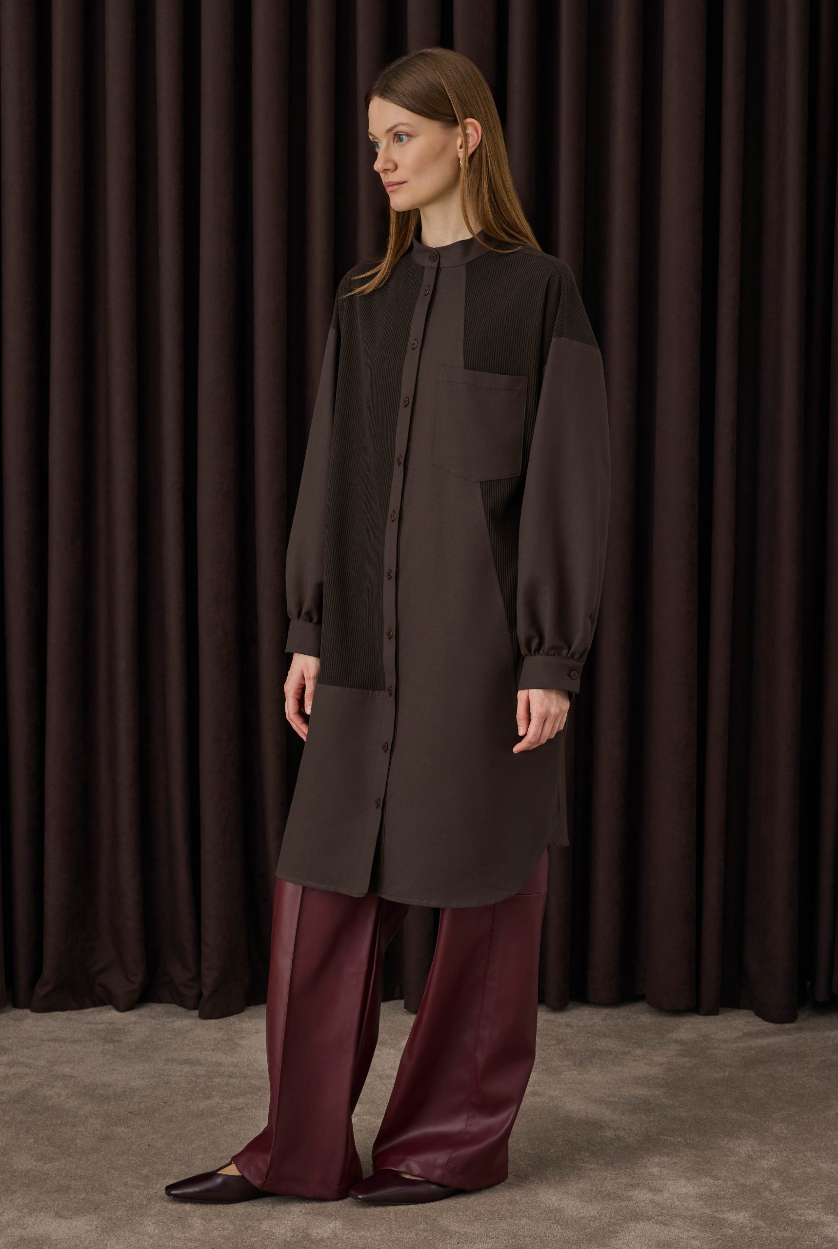 %70 polyester ve %30 pamuk karışımlı kumaştan üretilen bu model, her iki lifin avantajlarını bir araya getirerek hem konforlu hem de dayanıklı bir kullanım sunar. Polyester, kumaşa formunu koruyan tok bir duruş ve uzun ömürlü bir yapı kazandırırken; pamuk lifi nefes alabilirliği ve doğal yumuşaklığıyla gün boyu konfor sağlar. Bu uyumlu karışım sayesinde gömlek hafif, kullanışlı ve modern bir dokuya sahip olur.Asimetrik kalıp yapısı modeli sıradanlıktan uzaklaştırarak dinamik bir görünüm yaratır. Özenle yerleştirilen kadife garniler, pamuklu gabardin yüzeyle güçlü bir kontrast oluşturarak gömleğe zengin bir dokusal derinlik katar. Kadifenin yumuşak ve lüks hissiyle gabardinin mat, tok yapısının birleşimi; modele modern, sofistike ve karakterli bir stil kazandırır. Bu özel dokuların uyumu ve asimetrik formu sayesinde gömlek, hem günlük kullanımlarda hem de şehirli ve şık kombinlerde kendi başına dikkat çeken bir parça hâline gelir..Kalıp bilgisi:Rahat bir kalıptır. Salaş bir duruş tercih etmezseniz bir beden küçük alabilirsiniz.Bakım önerisi: 30°C’de benzer renklerle yıkayınız. Ağartıcı kullanmayınız. Düşük ısıda ütüleyiniz.