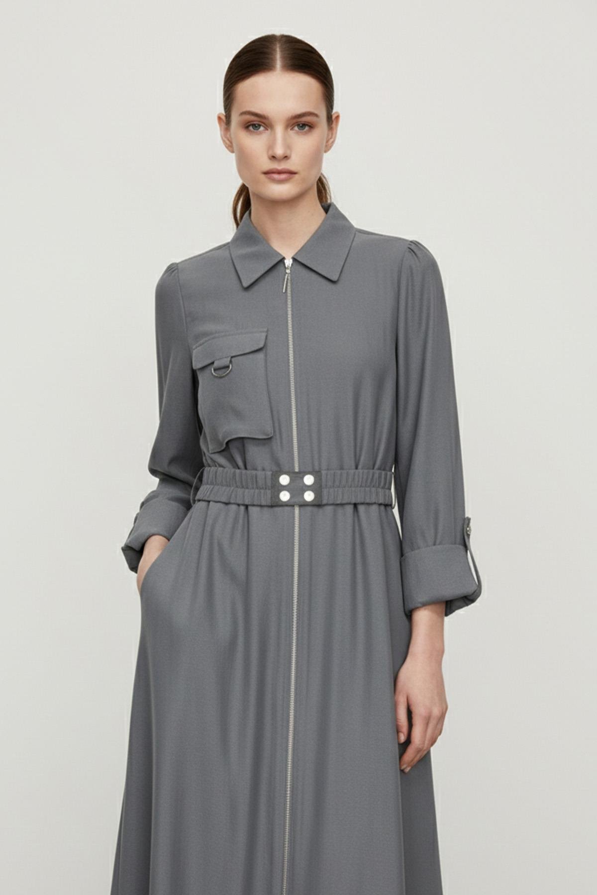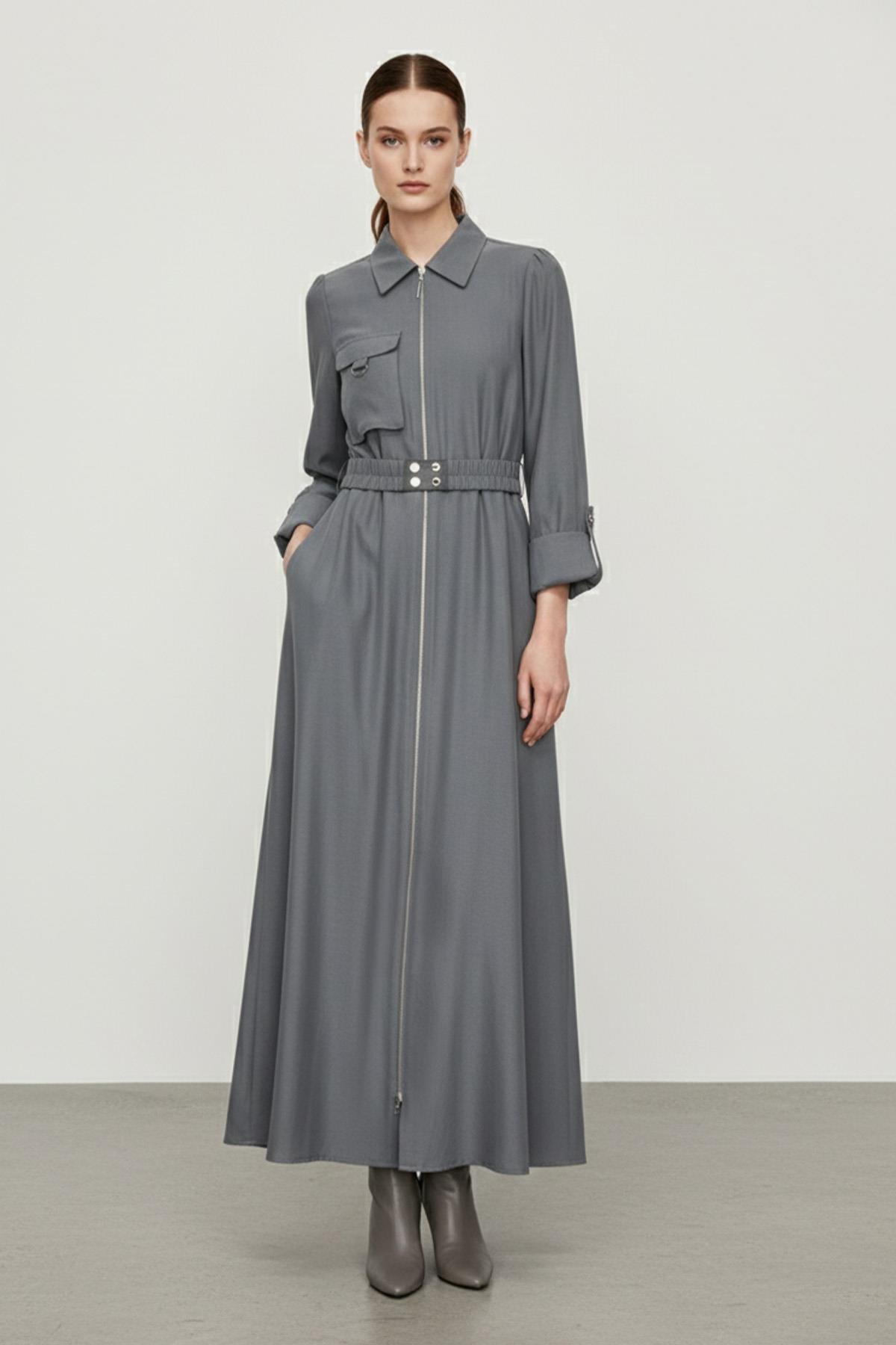 Kadın Fermuarlı Gömlek Yaka Belden Kemerli Uzun Elbise-12667 – ANTRACITE