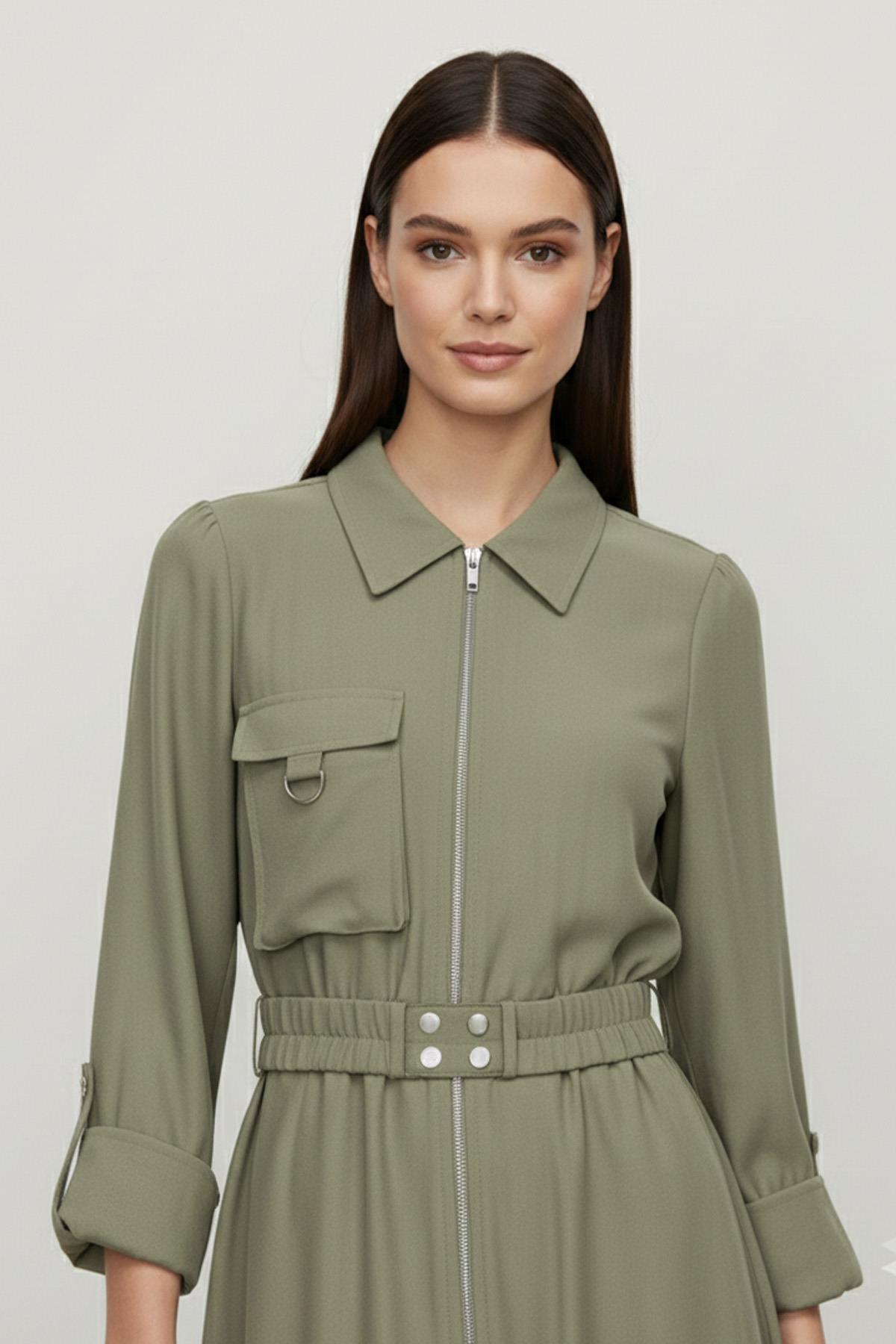 Kadın Fermuarlı Gömlek Yaka Belden Kemerli Uzun Elbise-12667 – KHAKI