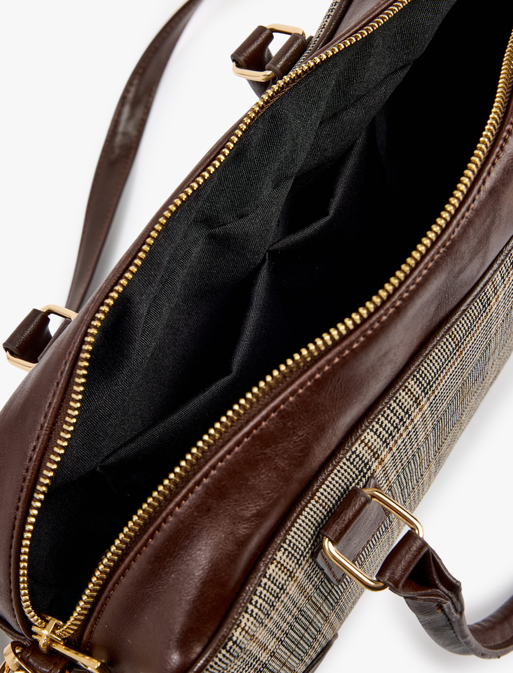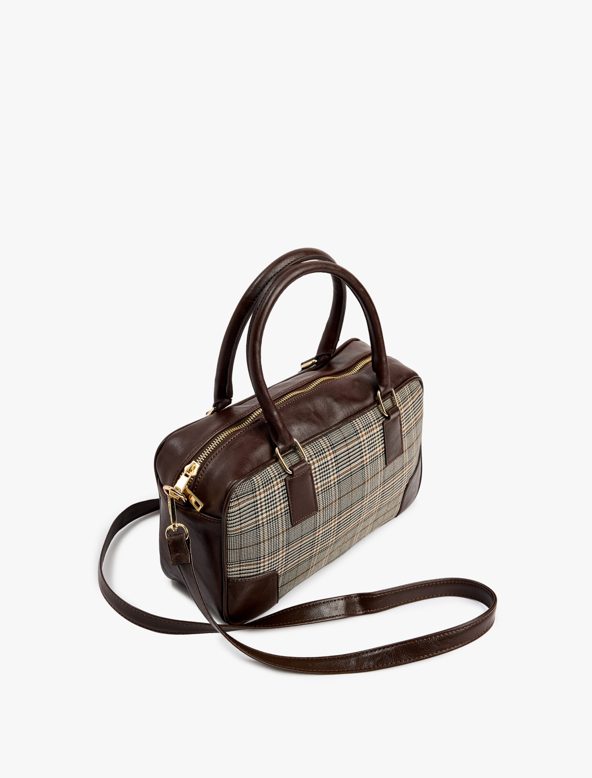 Suni deri detaylı saplı askılı ekoseli omuz çantası. Dış: %3 ELASTAN, %62 POLİESTER, %35 VİSKOZ