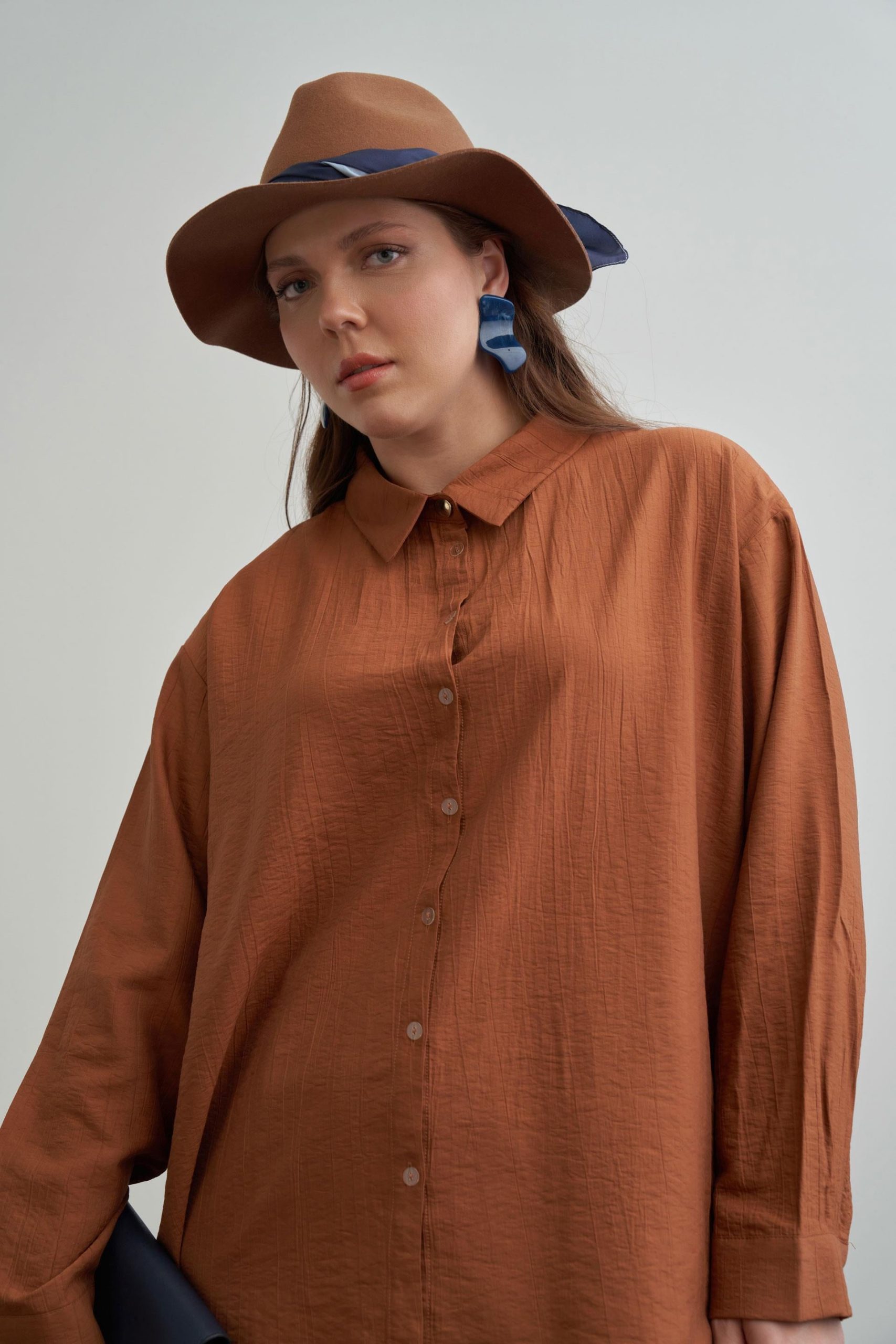 Kahve-KÖŞE MANŞET DETAYLI ŞIK DÜĞMELİ GÖMLEK