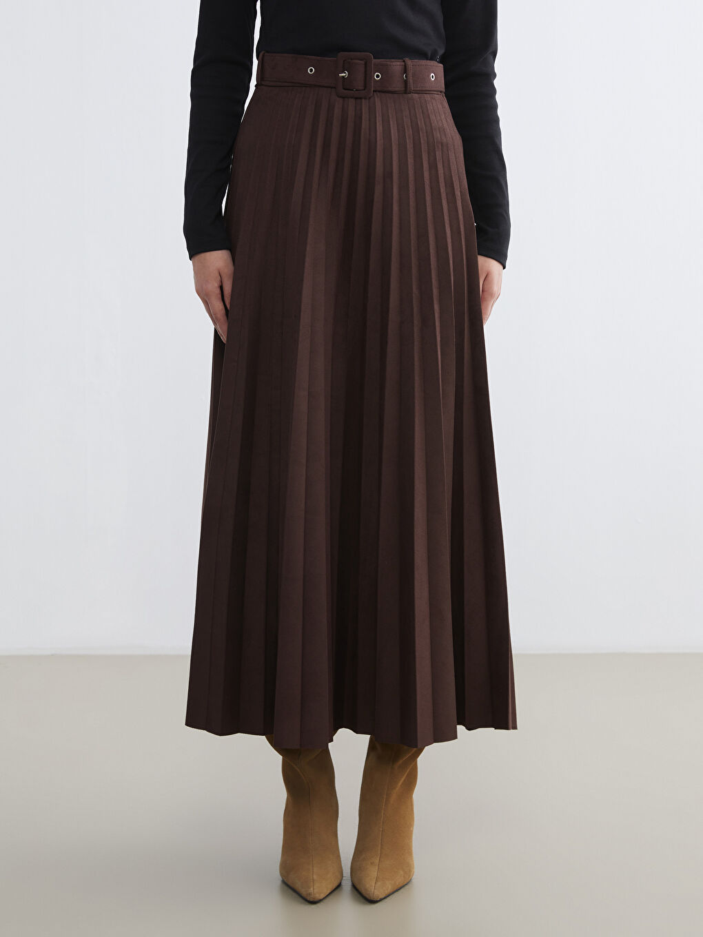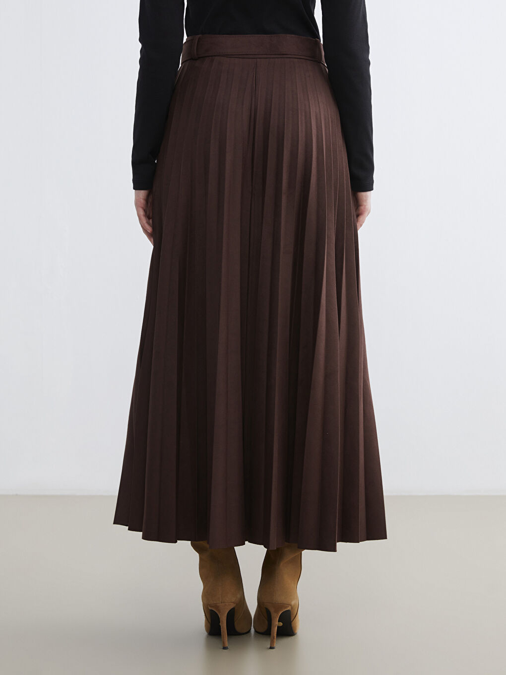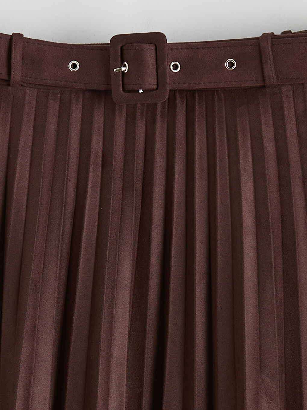 Kahverengi Beli Fermuarlı Süet Görünümlü Pileli Etek