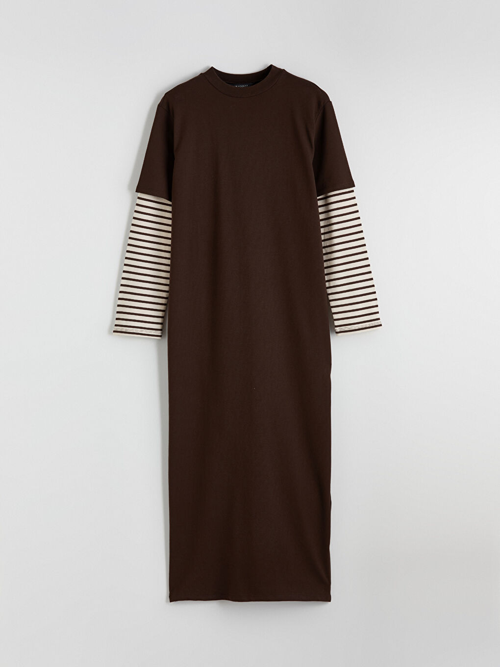 Kahverengi Bisiklet Yaka Çizgili Sweat Elbise