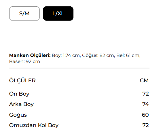 Not: Verilen ölçüler en küçük bedene aittir, bedenler arasında ortalama 4 cm fark bulunmaktadır.