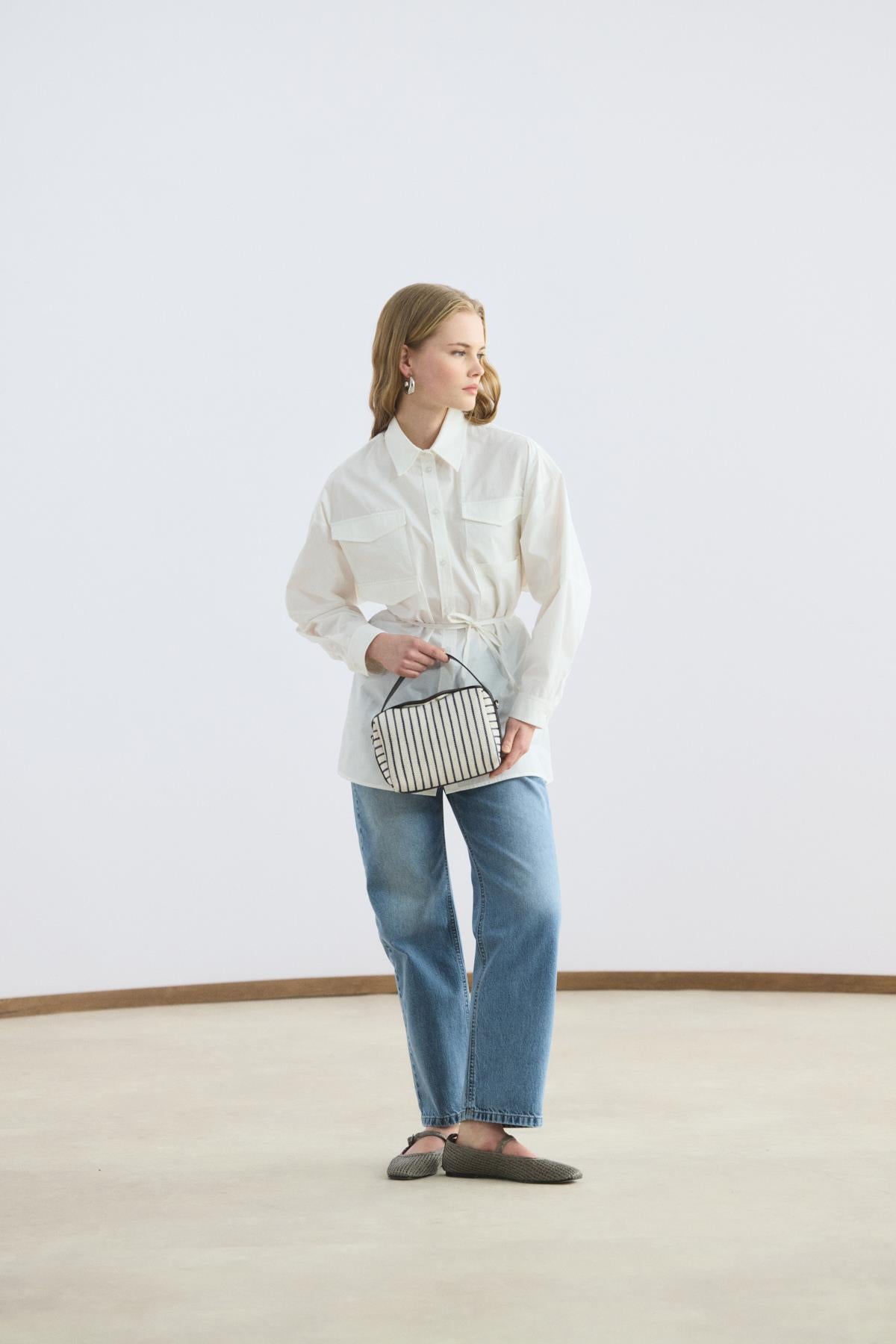 Deri Detaylı Kanvas Çanta Çizgili, %100 pamuklu dokusu ve deri dikiş detaylarıyla modern bir görünüm sunar. Mıknatıs kapamalı pratik kapağı ve demir logo detayı tasarıma güç katarken; deri el askısı ve çıkarılabilir çapraz askısı, çantanızı gün boyu dilediğiniz gibi taşımanıza olanak sağlar.